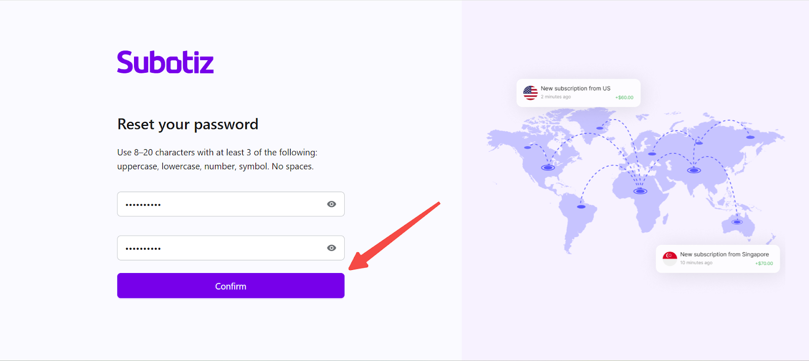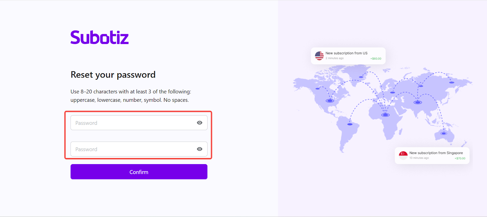 Subotiz provides a secure login and password reset process, enabling account owners and staff to reliably access the admin. With clear password rules and verification safeguards, accounts remain protected while ensuring a straightforward way to regain access when needed.