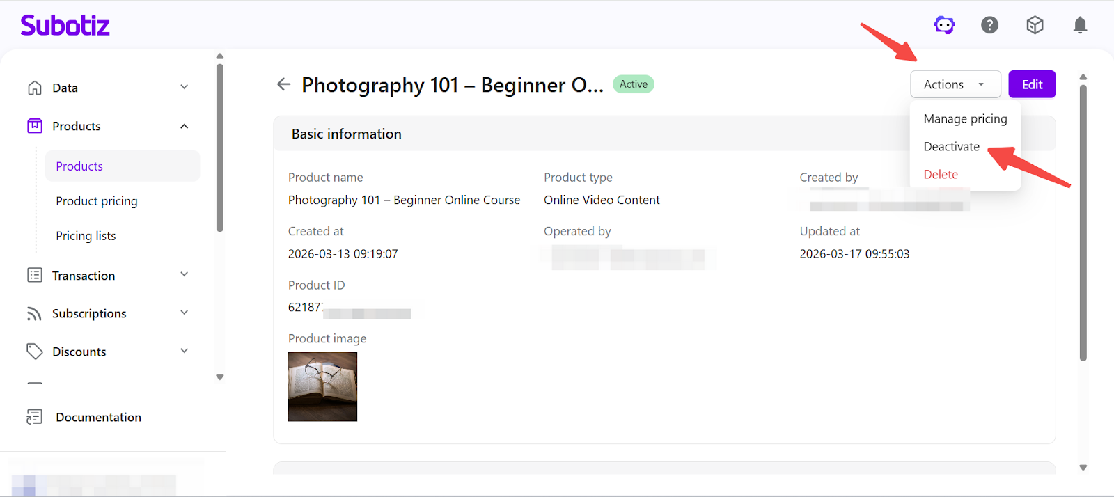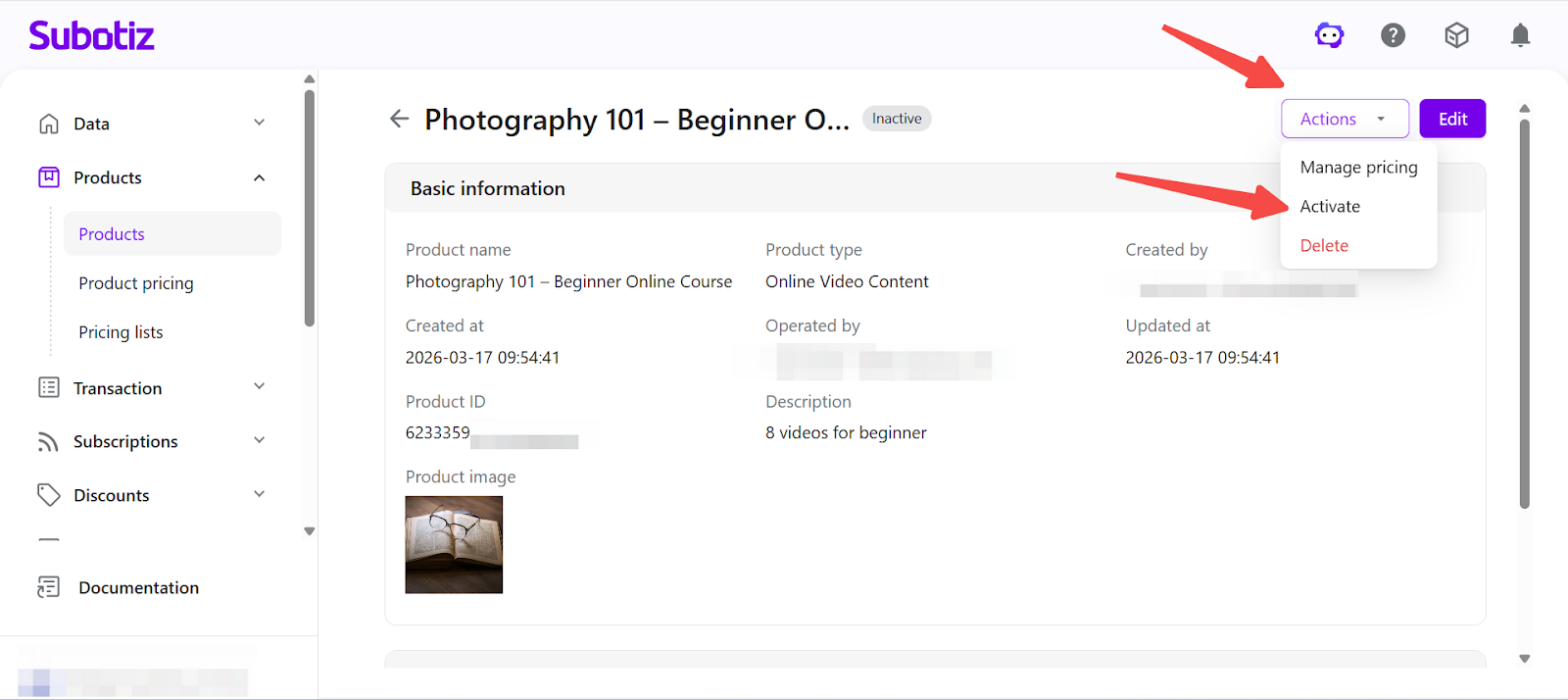 - Activate a product: If a product is currently inactive, open the product detail page and click Actions > Activate. Once activated, the product becomes available for pricing and checkout.
