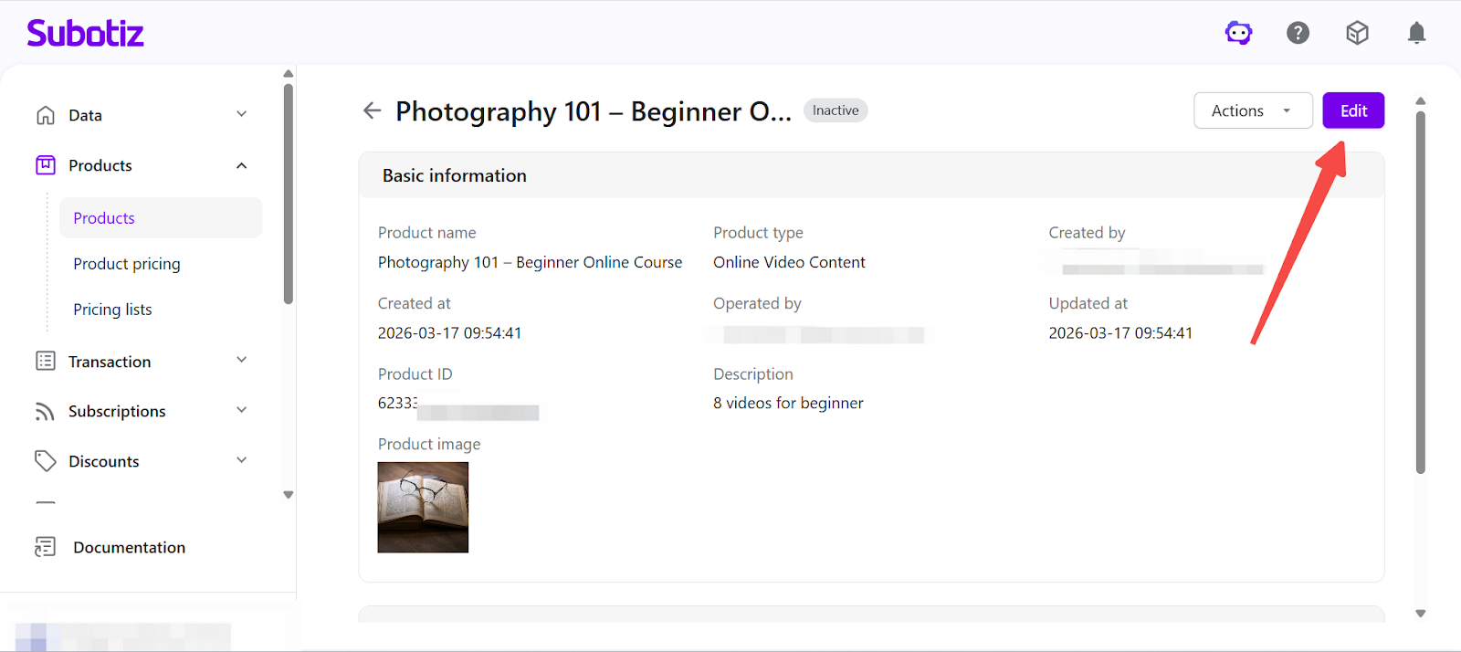 - Edit product information: To update product details such as name, image, or description, open the product and click Edit.