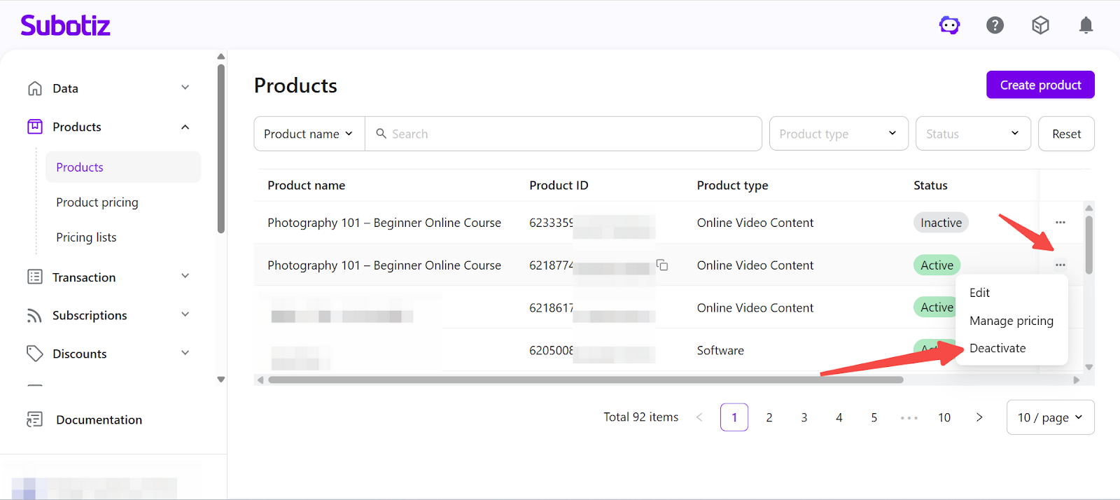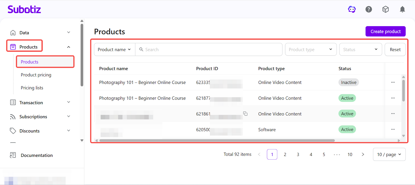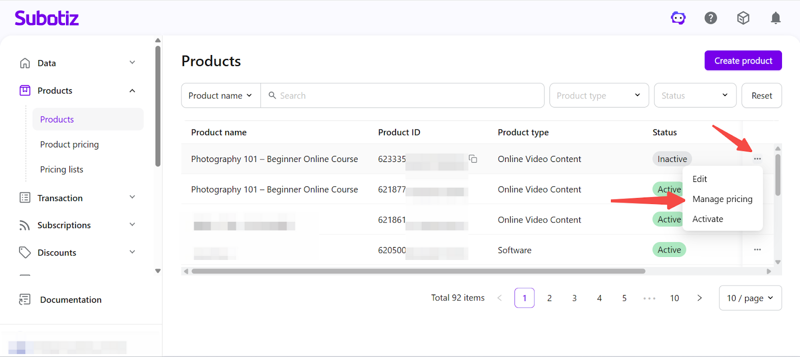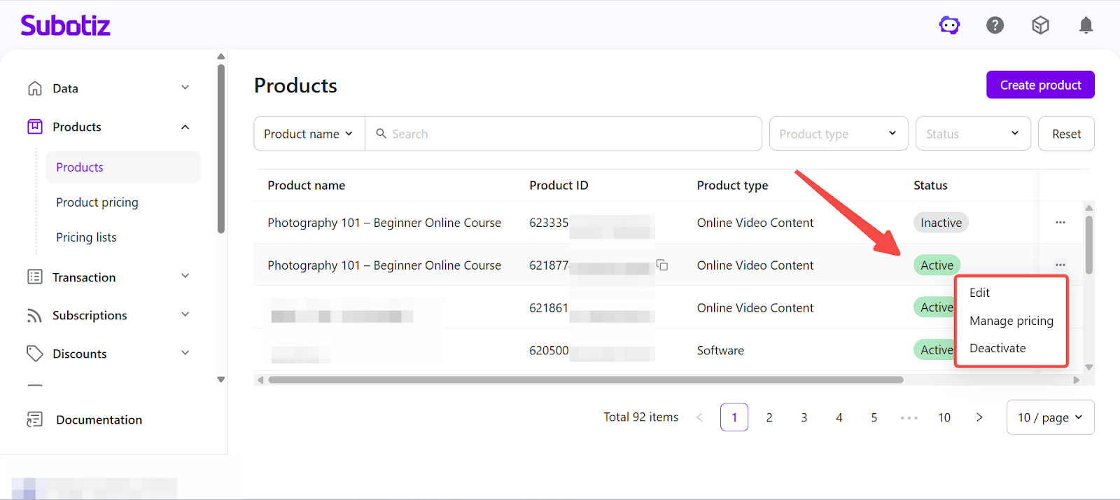 In Subotiz, the Products page provides a centralized view of all created products. You can review product statuses and perform actions such as editing, activating, deactivating, or deleting products. Properly managing product statuses ensures that only valid products are used in pricing configurations and checkout flows.