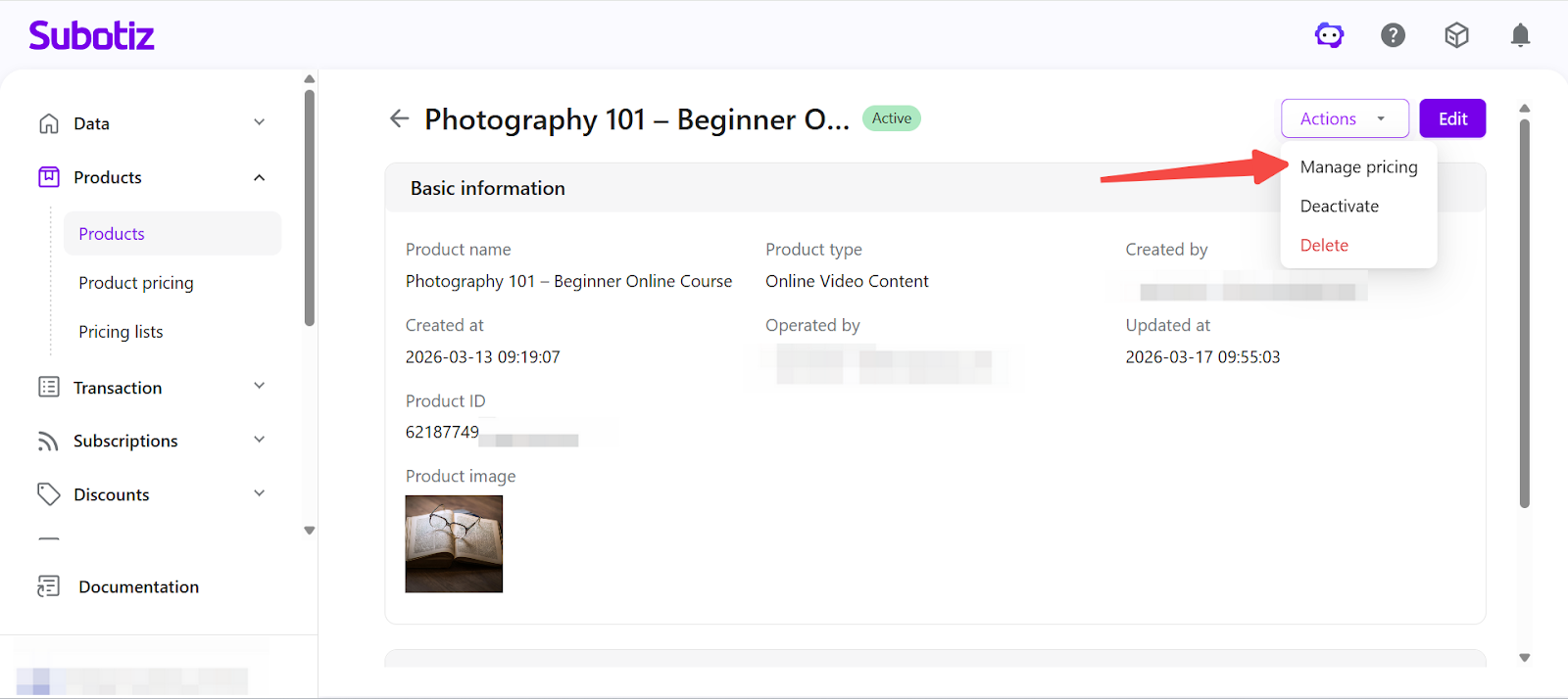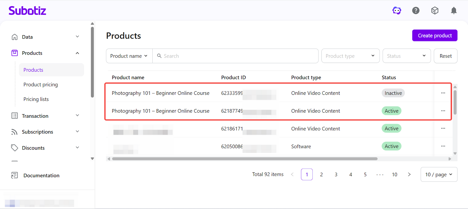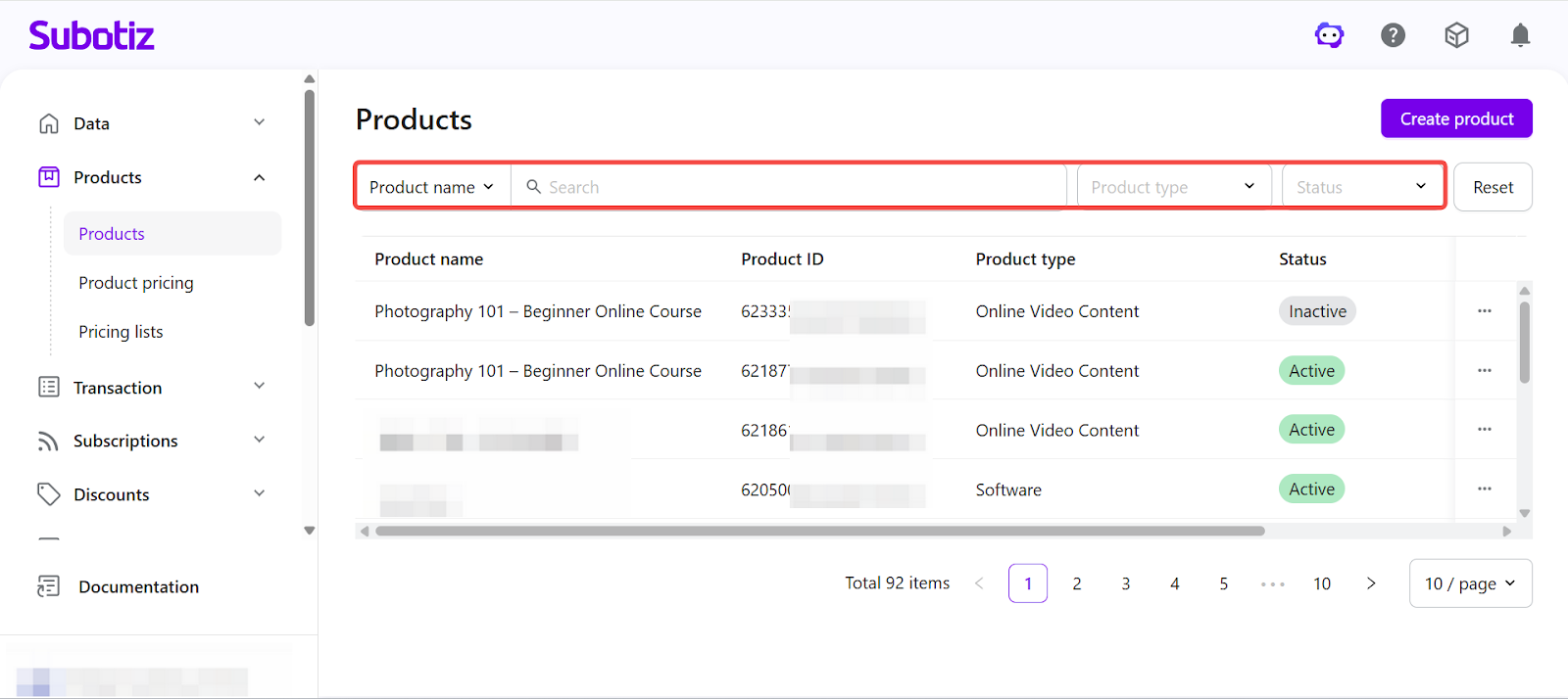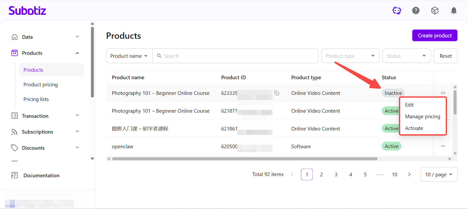 In Subotiz, the Products page provides a centralized view of all created products. You can review product statuses and perform actions such as editing, activating, deactivating, or deleting products. Properly managing product statuses ensures that only valid products are used in pricing configurations and checkout flows.