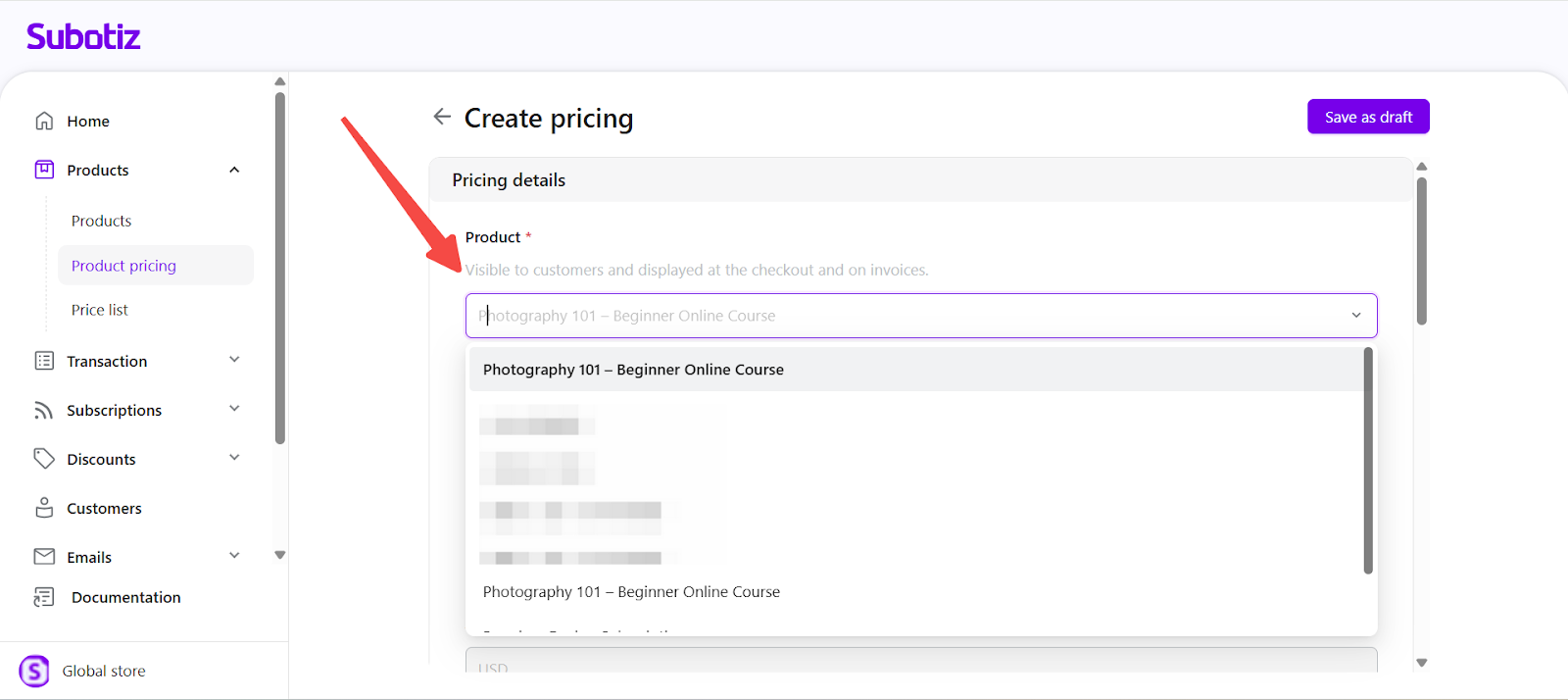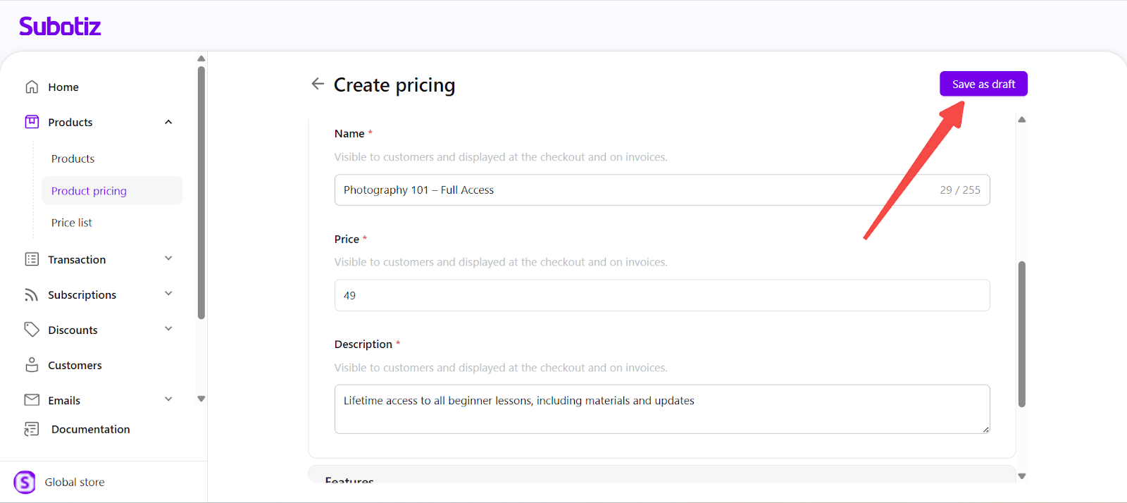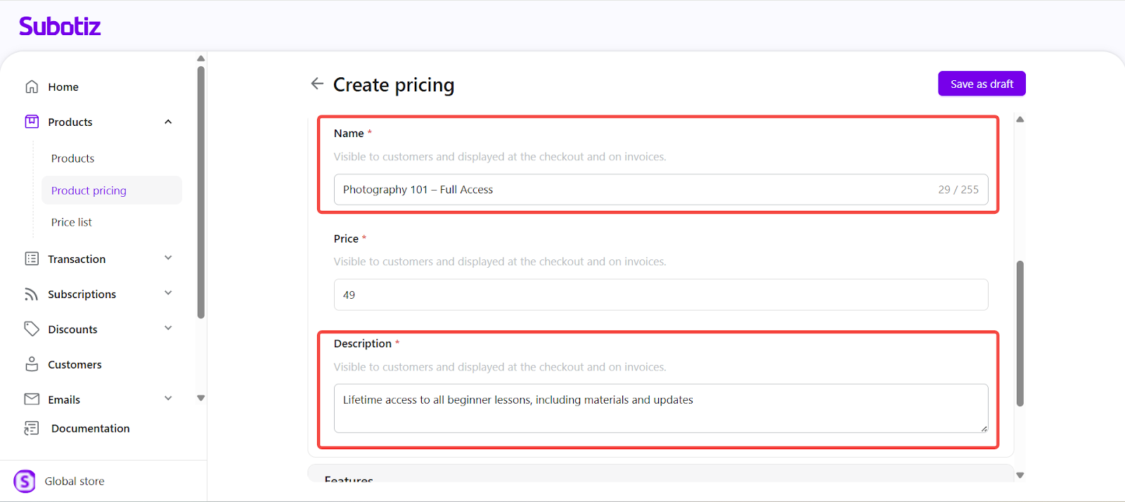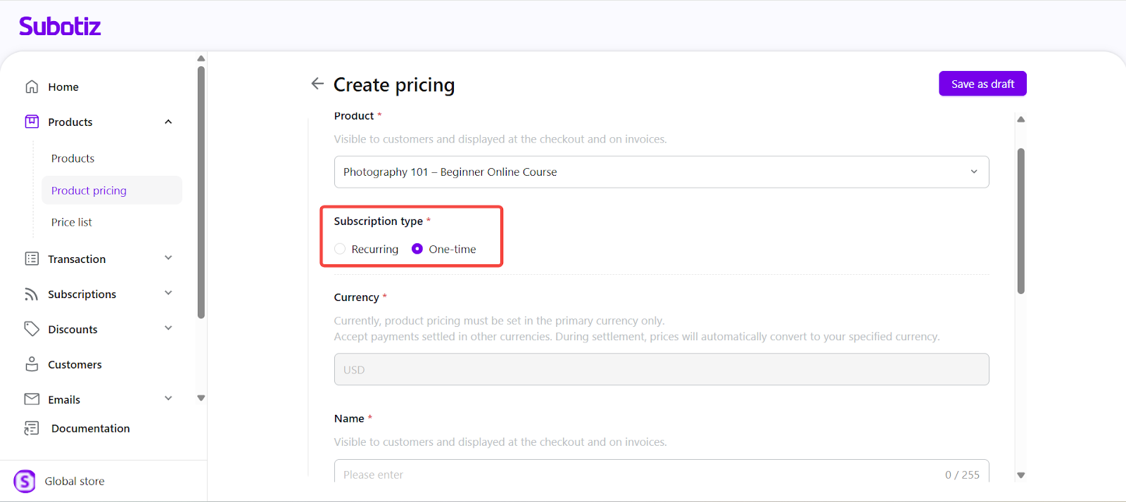 Subotiz allows you to set a one-time price for any Product to collect a single upfront payment. This setup is ideal for digital downloads, online courses, consulting sessions, or any product that does not require recurring billing. A clear, fixed price paired with a recognizable product name ensures customers immediately understand the charge during checkout.