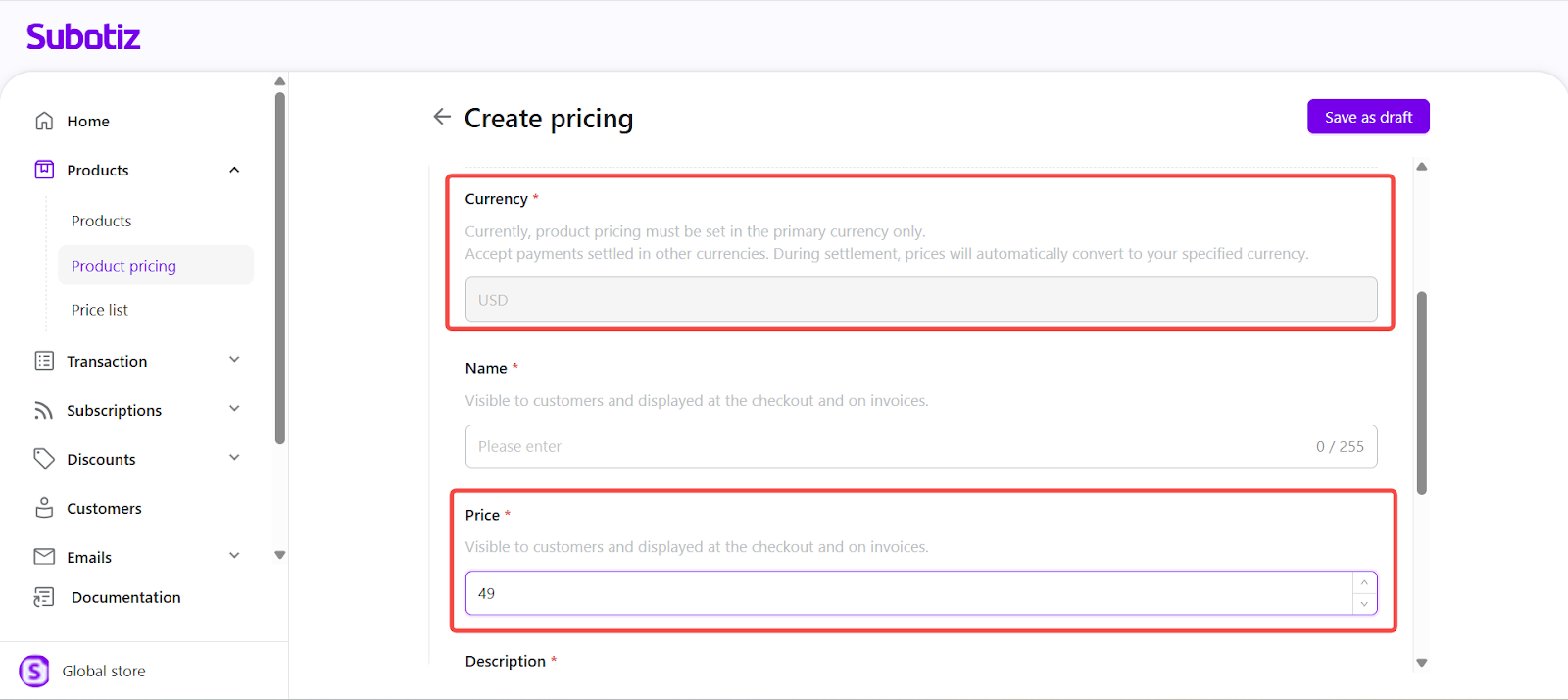 - Example: Set the price to 49.00 in your store’s settlement currency (e.g., USD).