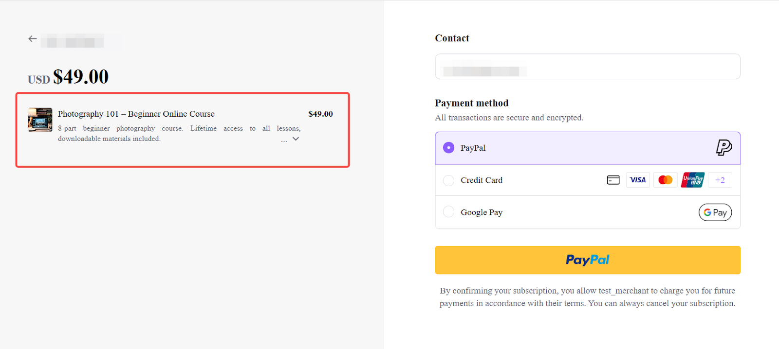 At checkout, the pricing name, description, and total one-time charge will be clearly displayed.