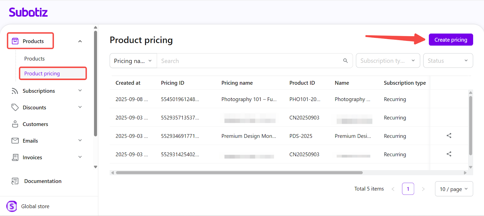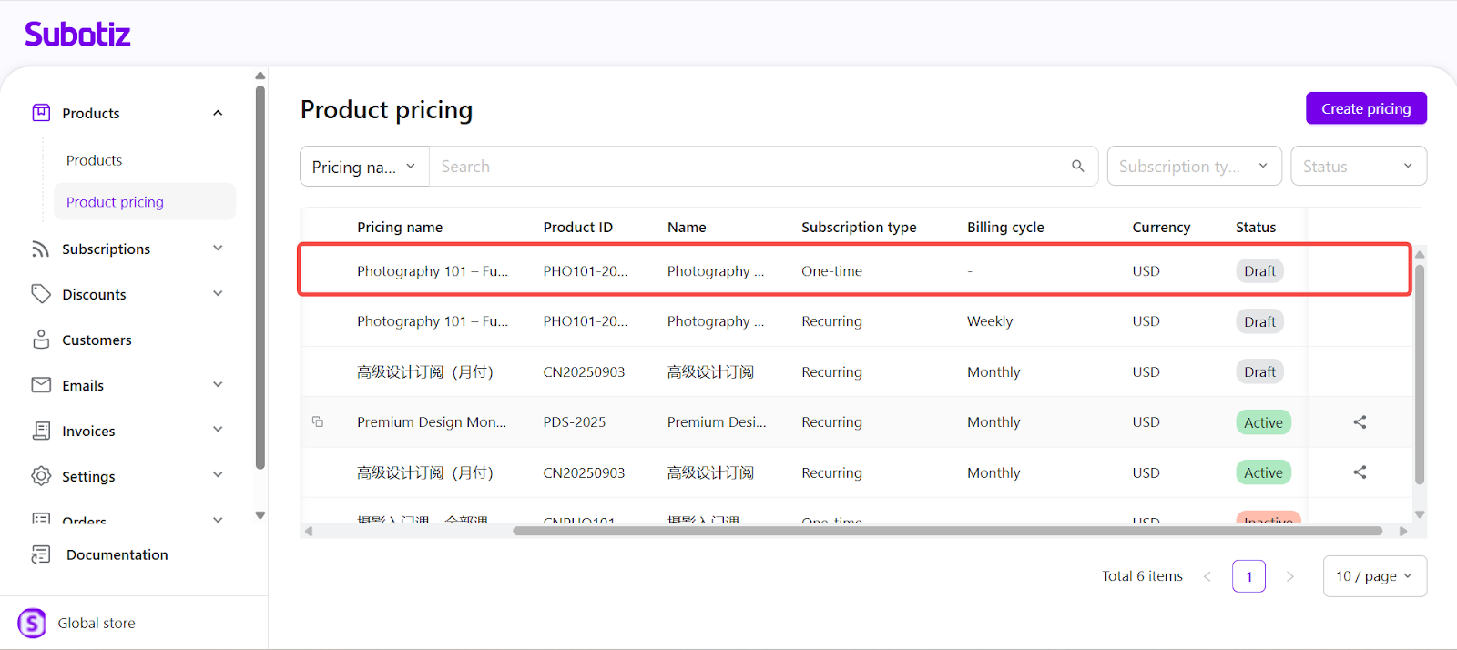 One-time pricing in Subotiz is ideal for fixed offerings such as ebooks, online courses, or consultations. It keeps billing records organized, simplifies catalog management, and offers flexibility for lifetime or limited access without recurring billing.