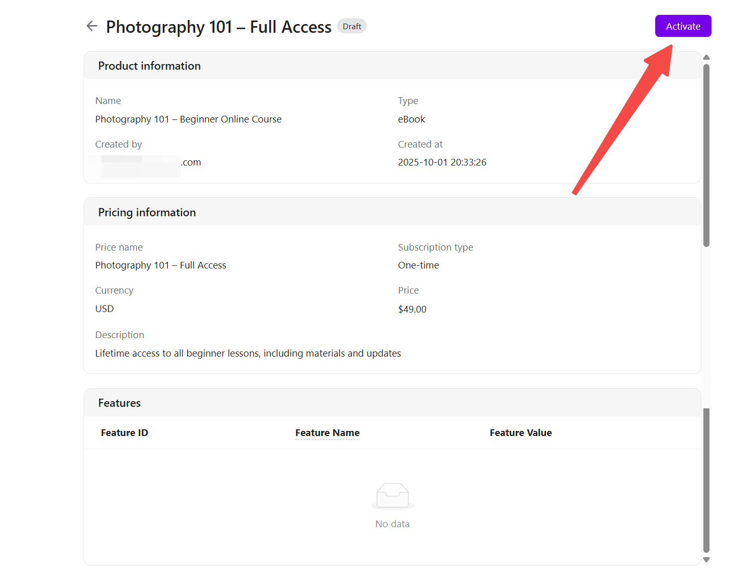 - Activate your pricing: Double-check all fields for accuracy. When everything looks right, click Activate at the top right. The pricing will go live and become available in checkout and invoice links.