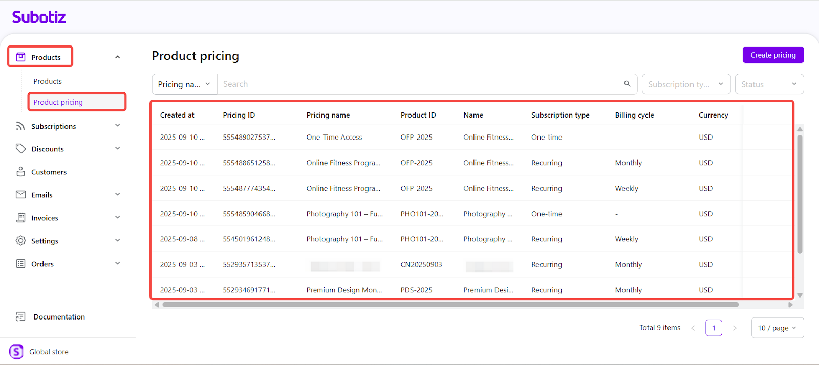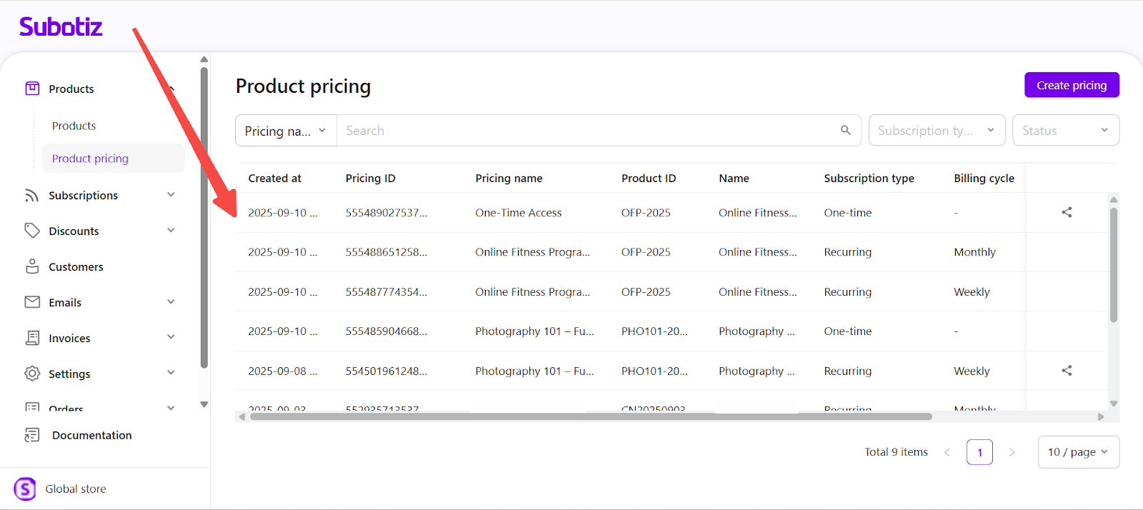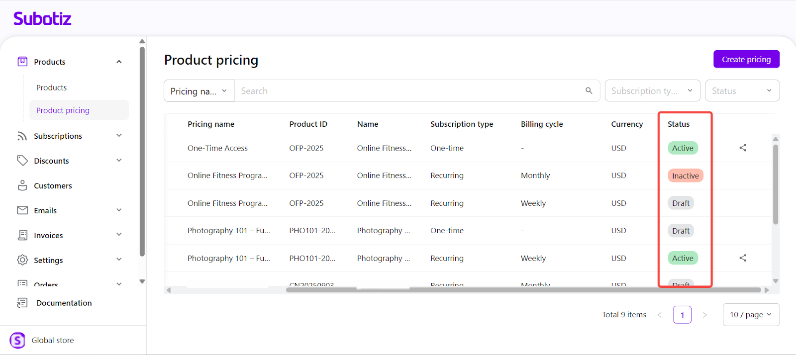 - Access your pricing list: Navigate to Product > Product Pricing in the Subotiz admin. Each row displays the pricing name, subscription type, billing cycle, and current status. This overview facilitates monitoring and quick decision-making.