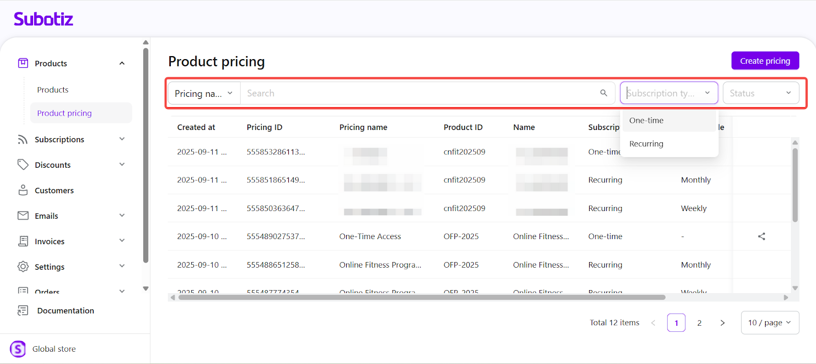 - Subscription type: Filter by One-time or Recurring.