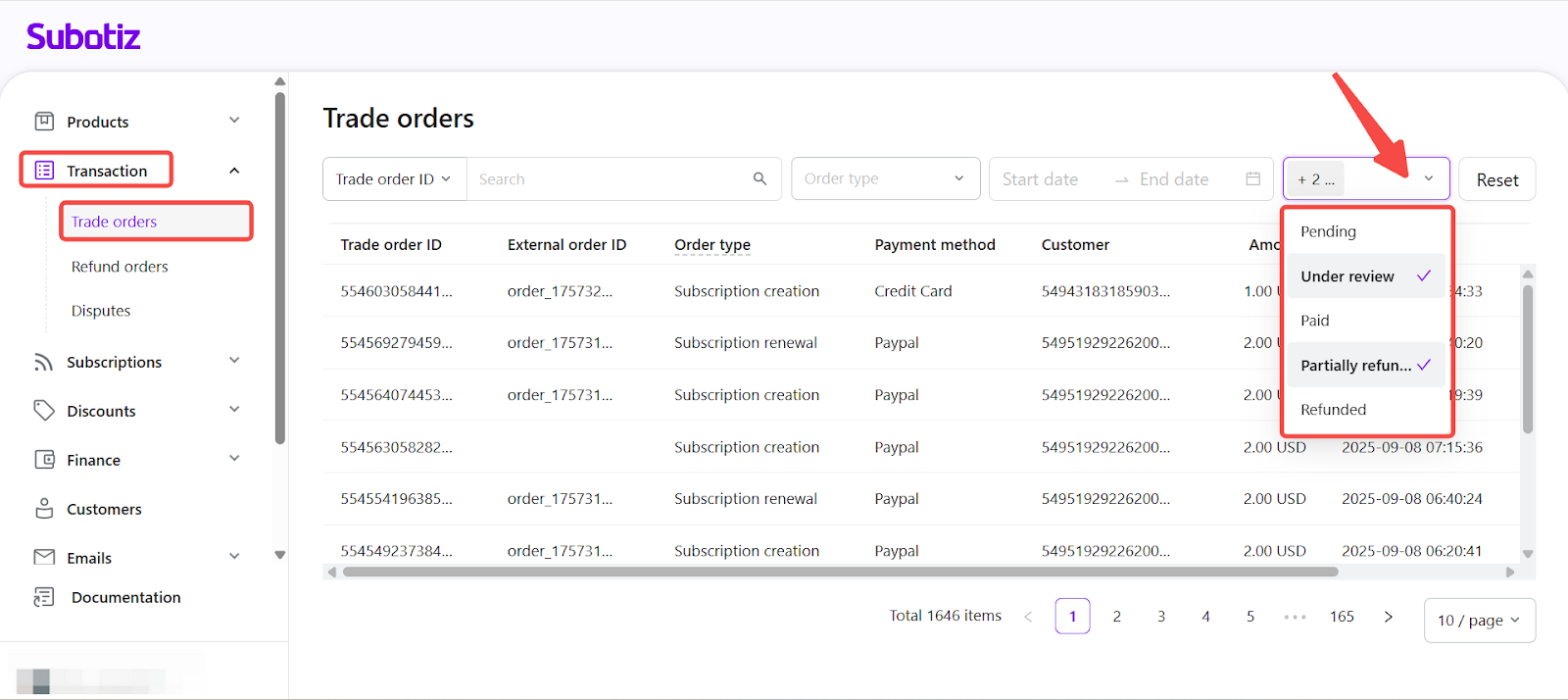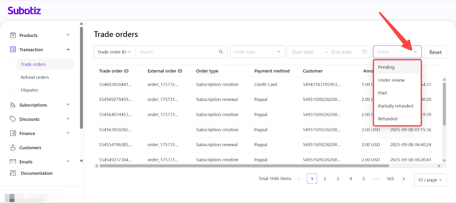 The Trade orders dashboard in Subotiz assigns a real-time payment status to every billing transaction based on responses from the connected payment gateway. These statuses apply to all order types, including one-time payments, subscription activations, and renewals. By reviewing and responding to specific statuses, merchants can troubleshoot payment issues promptly, minimize failed transactions, and keep customer accounts in good standing.