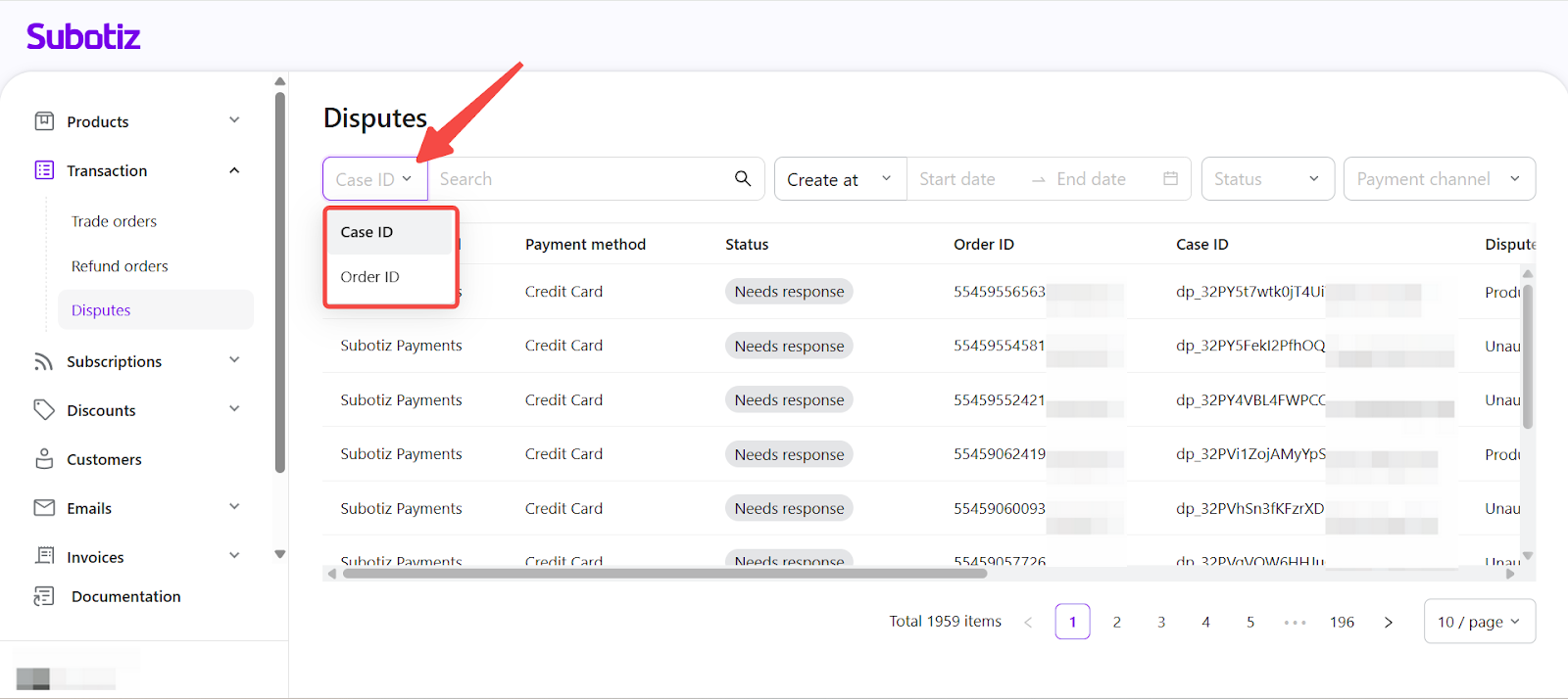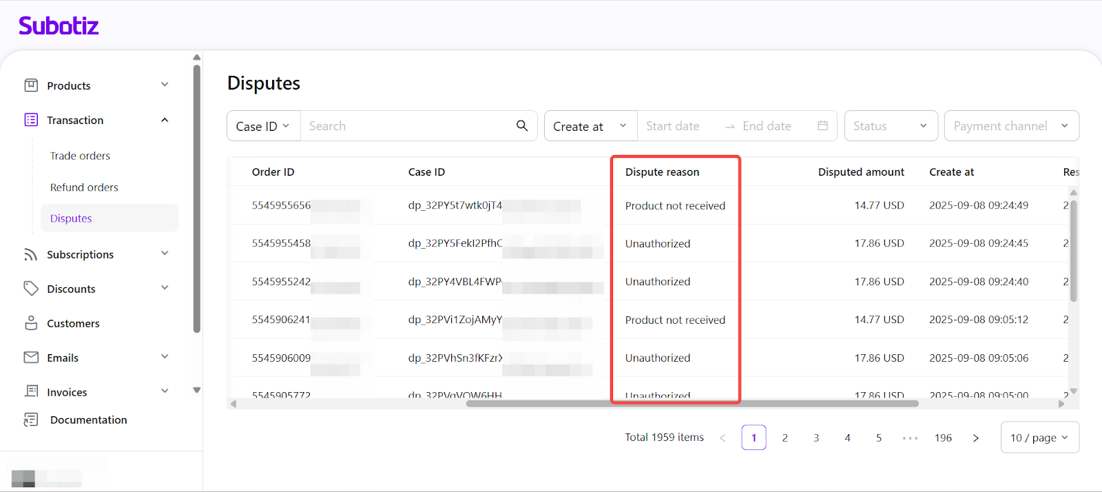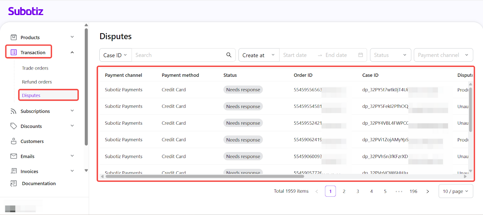 - Open Disputes: Go to Transaction > Disputes in the Subotiz admin to view all cases collected from supported payment channels.