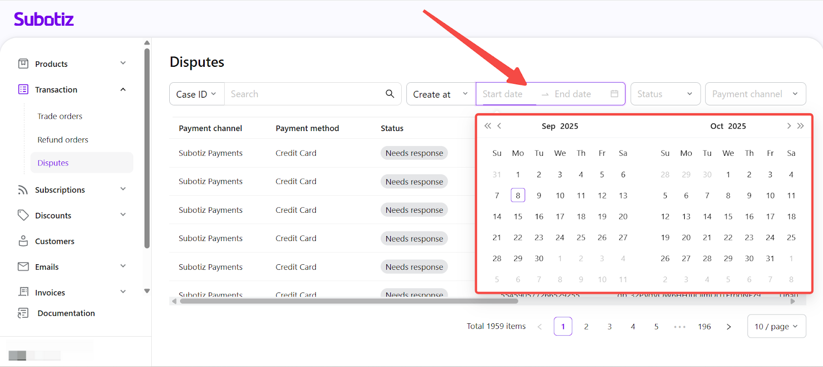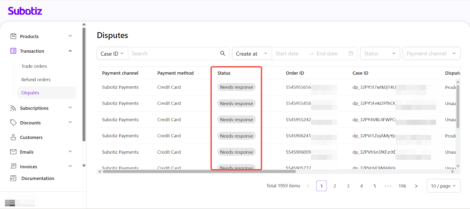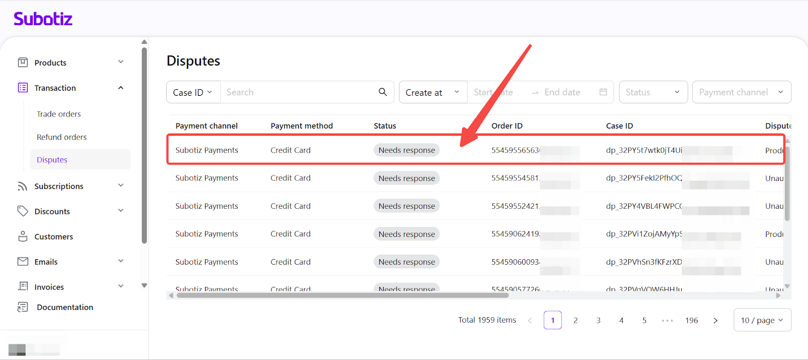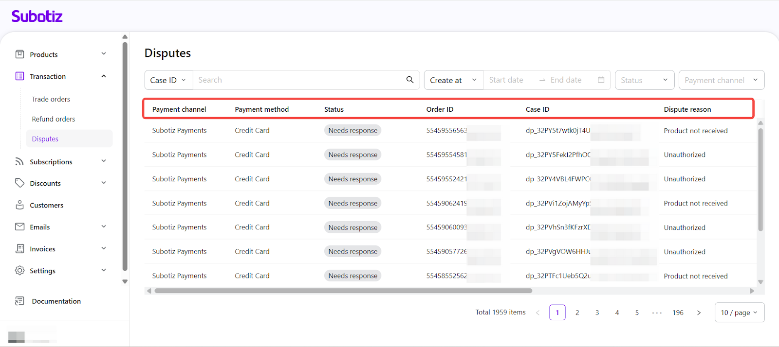 - Open Disputes: Go to Transaction > Disputes in the Subotiz admin to view all cases collected from supported payment channels.