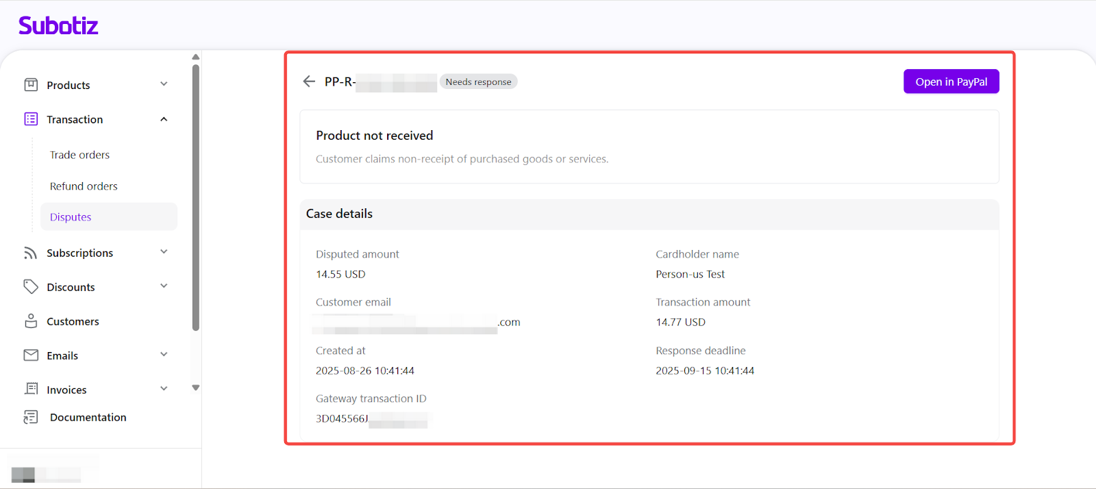 - Payment channel: Source of the dispute, such as PayPal or Subotiz Payments.