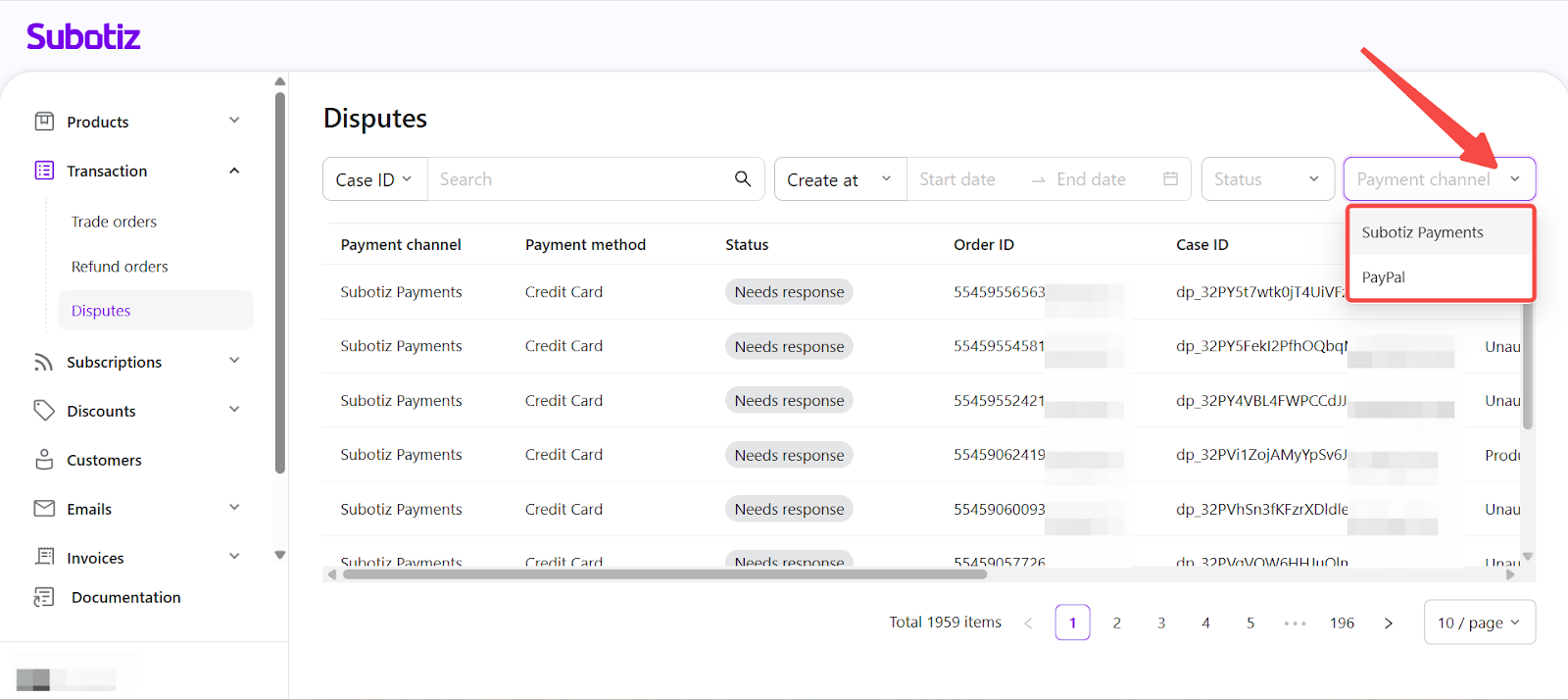- Organize by channel: Apply Payment channel filter to review Subotiz Payments and PayPal cases separately.