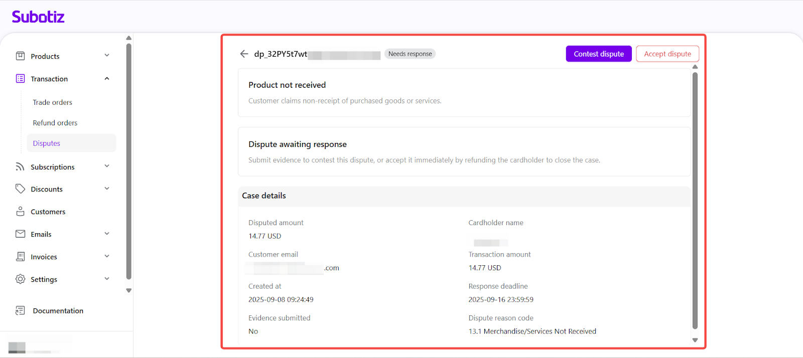Subotiz Payments | Needs response | Merchant required to accept dispute or submit evidence. |