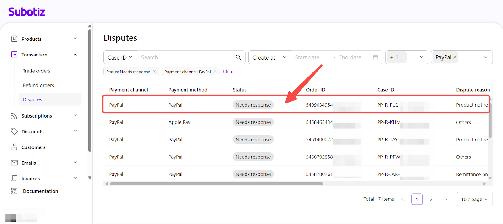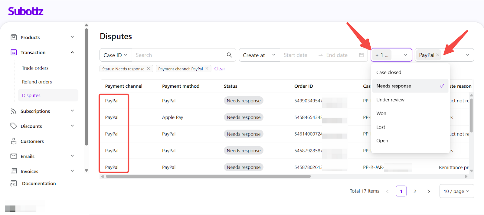 - Effective filtering: Use Payment channel and Status filters in Subotiz to quickly locate PayPal disputes requiring immediate action.