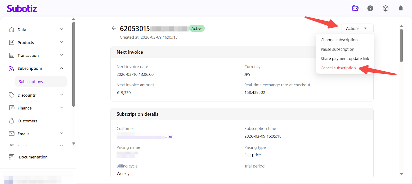 - Open the cancellation dialog: On the Subscription details page, review the customer email, subscription plan, and pricing information. Then click Actions > Cancel subscription.