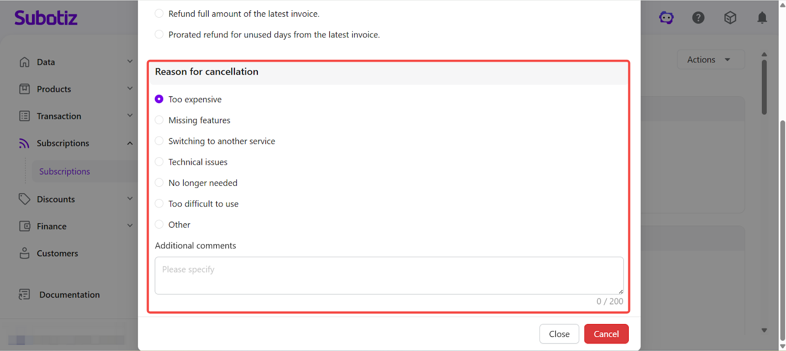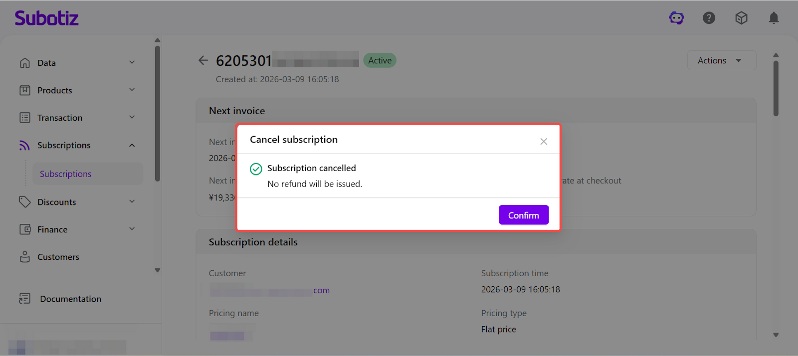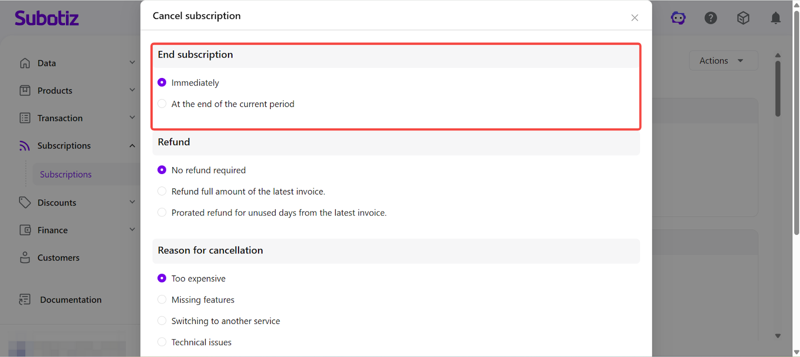 Canceling a subscription in Subotiz stops future renewals based on the selected cancellation timing and refund settings.