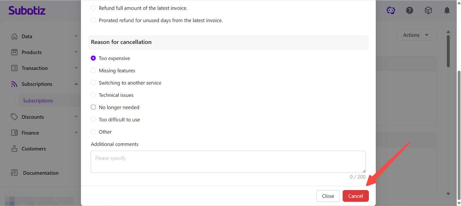 - Refund full amount of the latest invoice (if applicable)