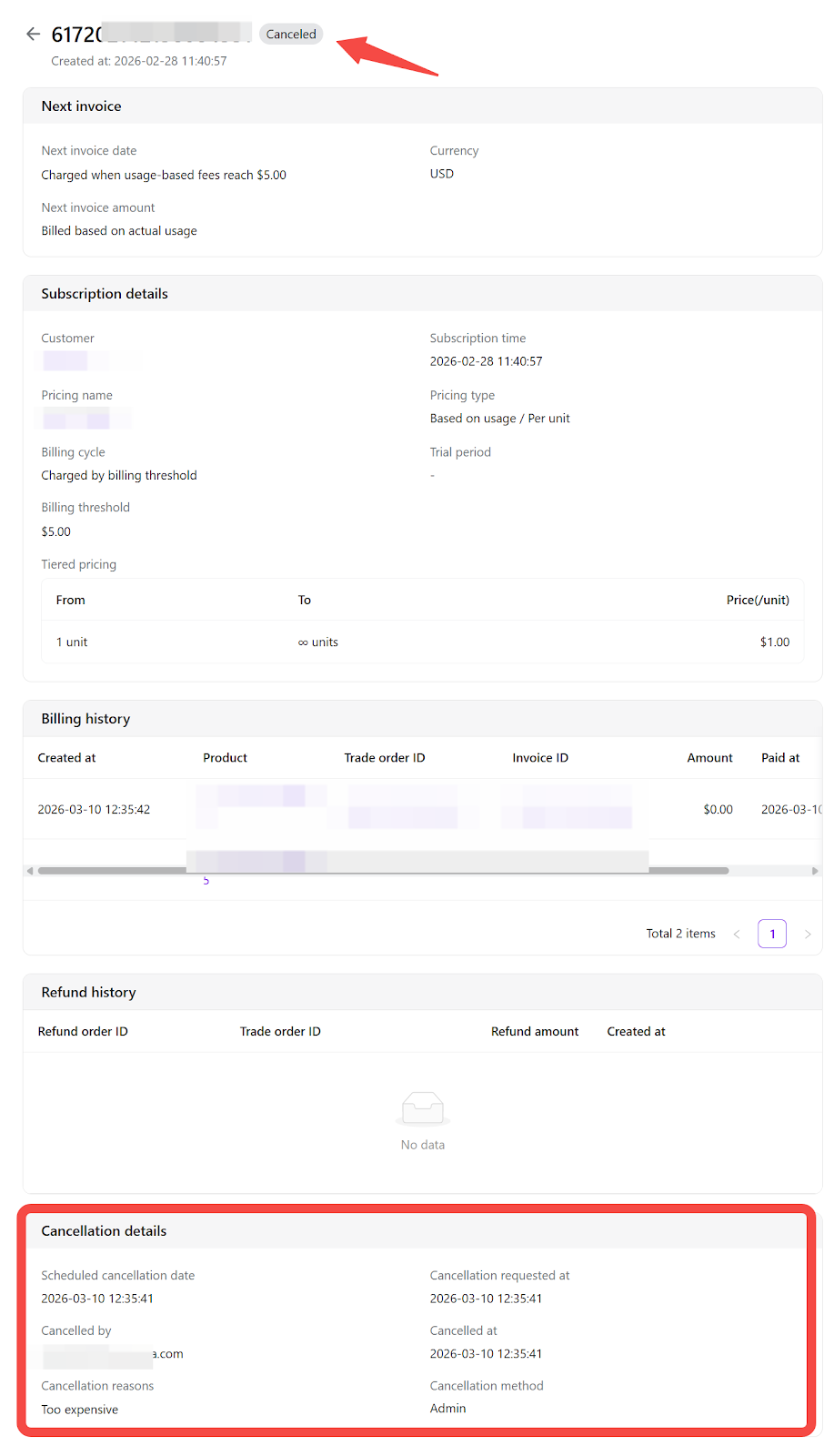 - Complete the cancellation: After submission, the system displays the cancellation result and updates the subscription status to Canceled.