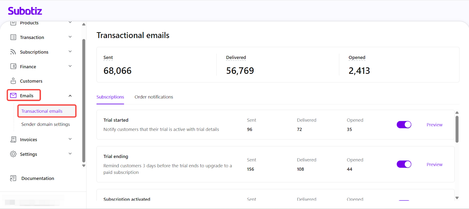 The Transactional Emails section in Subotiz centralizes all automated customer communications, ensuring timely updates on subscription and payment events. By tracking performance, previewing templates, and controlling email status, merchants can maintain consistency and improve engagement.