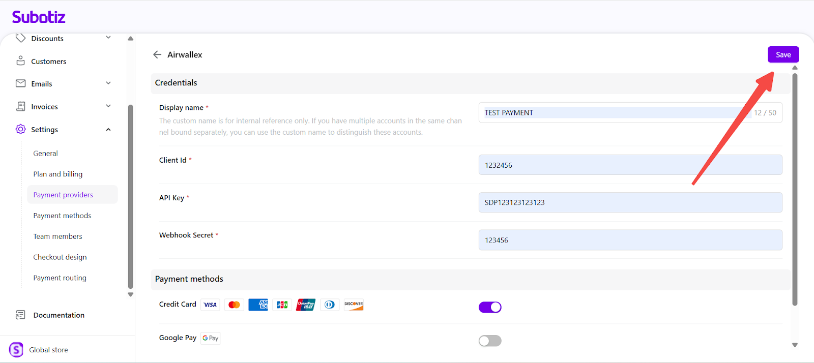 Check the provider’s documentation for specific credential requirements. A full list of supported payment methods and required credentials is available in Payment provider|Credential Requirements by Provider.