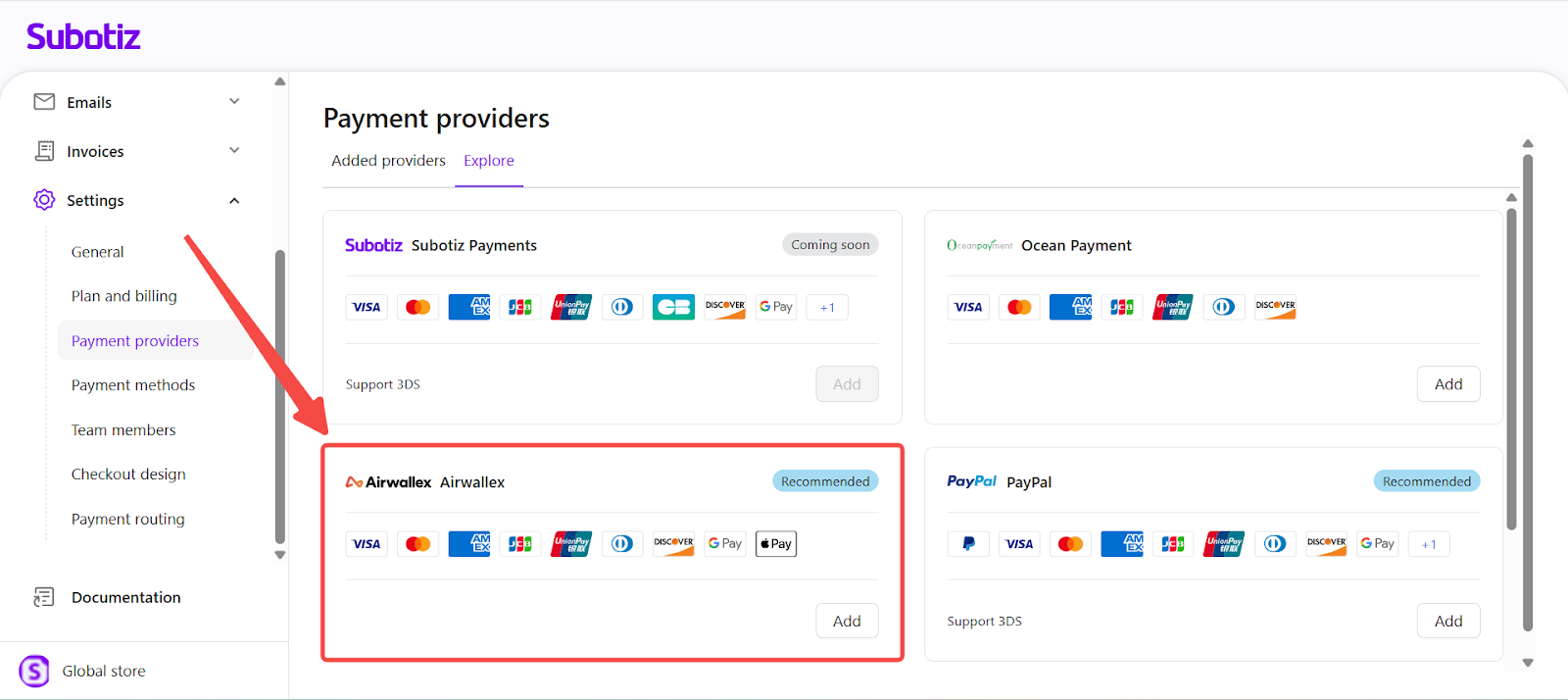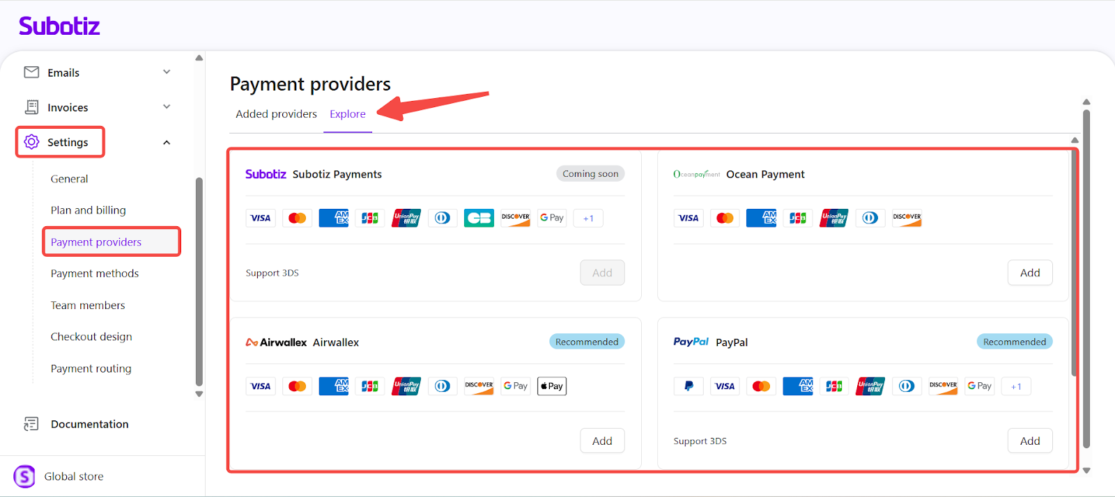 - Access the Explore tab: In the Subotiz admin, go to Settings > Payment Provider and open the Explore tab to browse all supported payment providers.