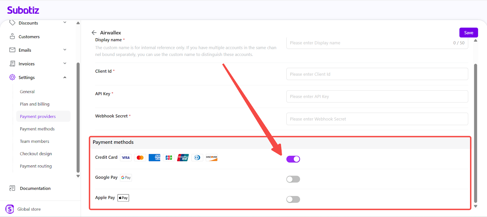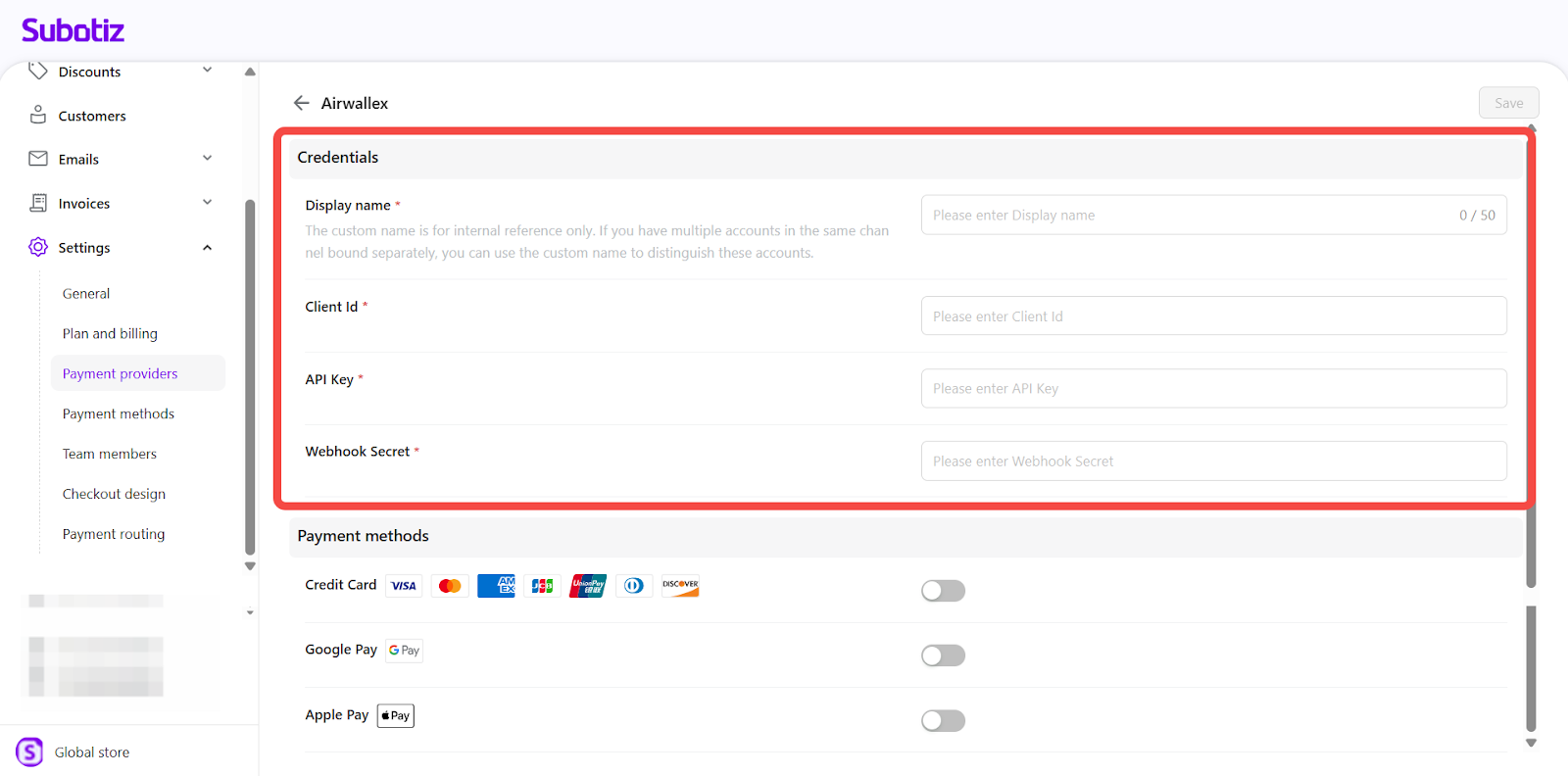 The Payment Provider integration in Subotiz supports multiple third-party payment gateways, allowing you to offer flexible and secure payment options to your customers. This guide explains how to connect a new provider, enter the required credentials, and enable supported payment methods from the Explore tab in the admin.