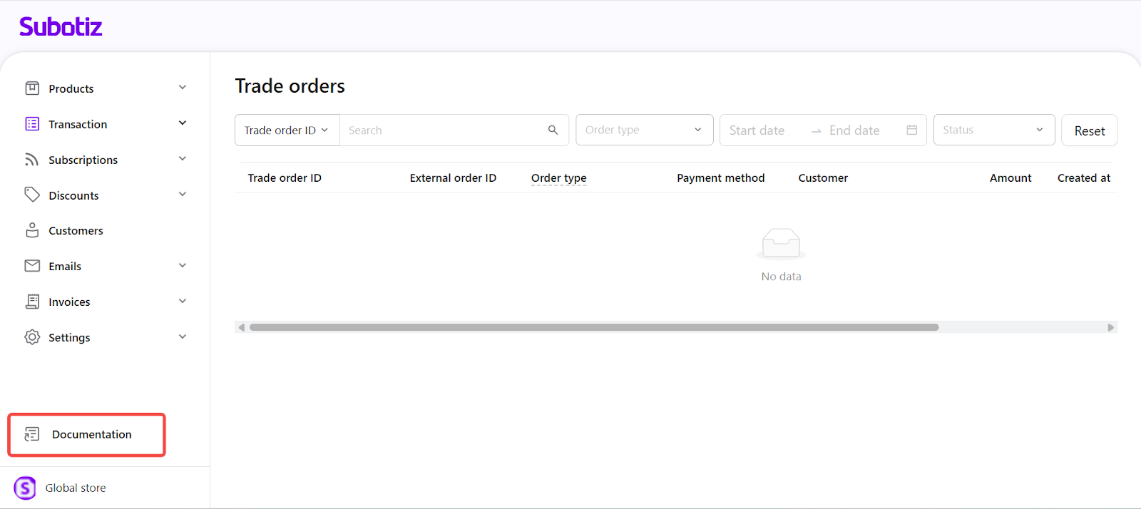- Access from admin: In the Subotiz admin, click Documentation in the left navigation bar.