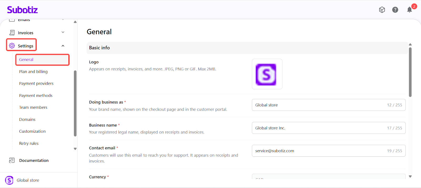 The General section contains the key business information applied across your Subotiz account. This includes your business name, logo, address, and support email. These details appear on invoices, receipts, checkout pages, and customer communications. Keeping this section accurate ensures your business is represented consistently across all key touchpoints.