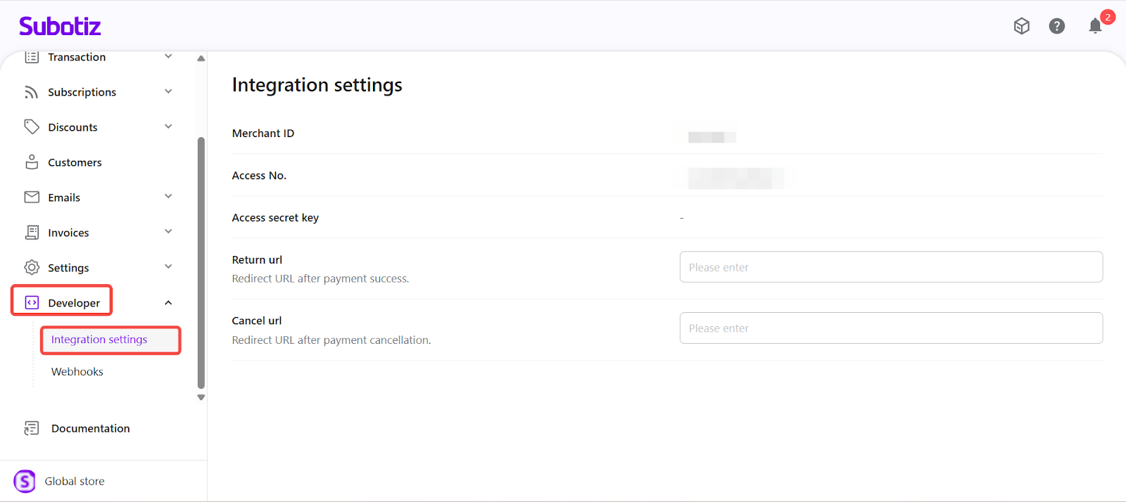 - Open the Developer section: Go to Developer > Integration settings in the Subotiz admin.