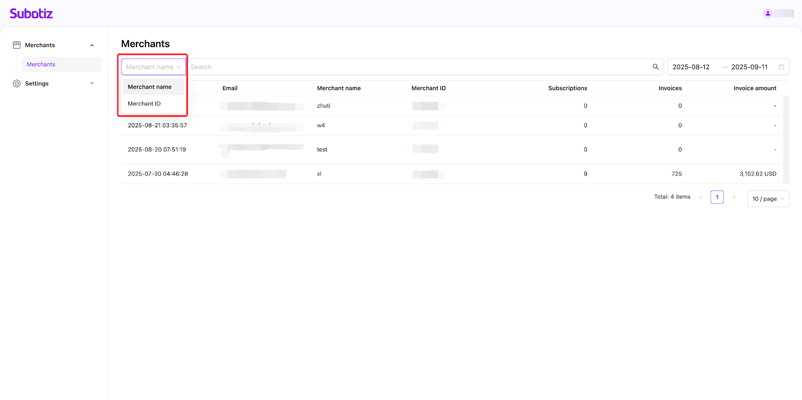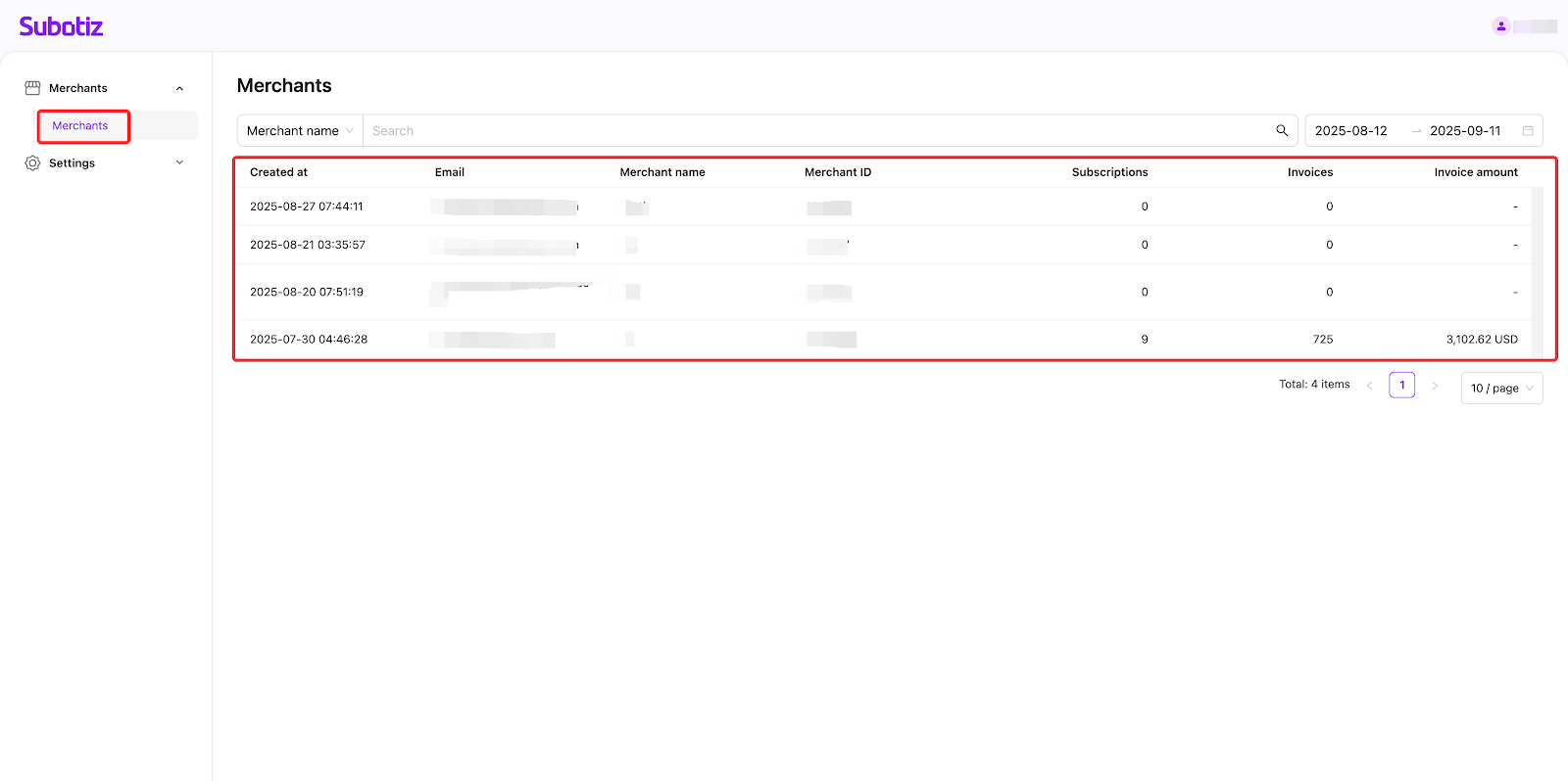 - Get started: Log in to your Subotiz Partner Platform and then click the Merchants> Merchants section. Each row displays key information, including Email, Merchant name, Merchant ID, Subscriptions, Invoices, and Invoice amount.