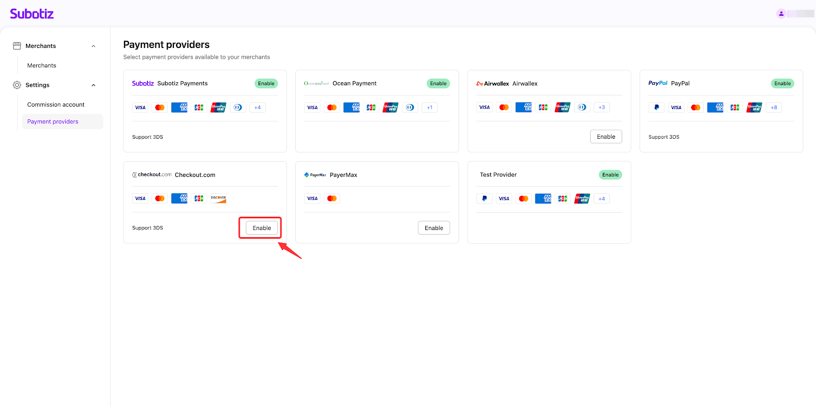 - Click 'Enable' to enable the payment providers as you want. Merchants can choose which payment providers to make available to their customers among those you have enabled.
