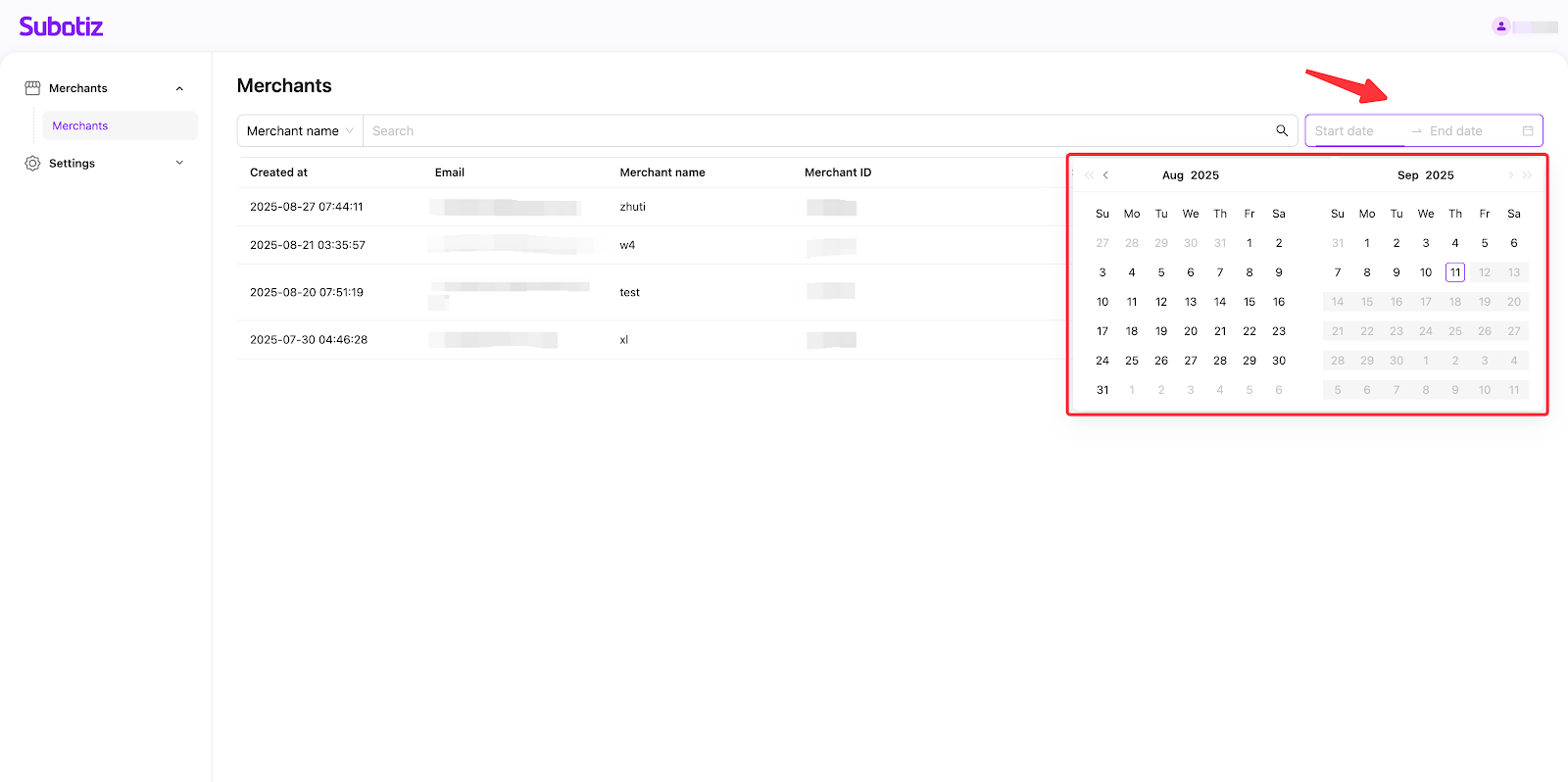 - Filter smartly: Use the time filter by selecting 'Start date' and 'End date'. This helps you locate merchants created during the period you select.