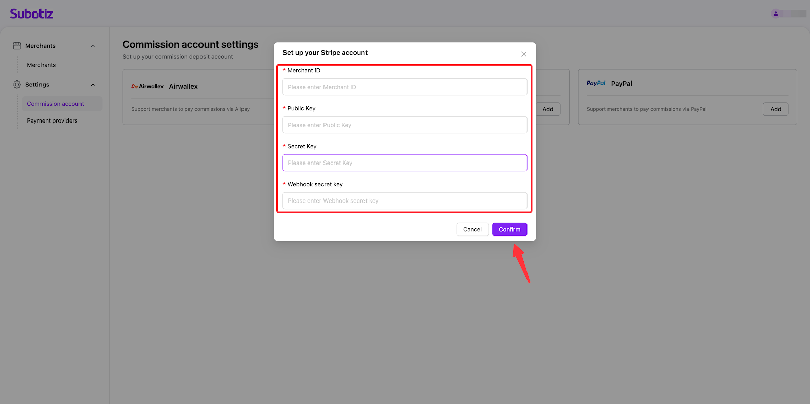 - Fill in credentials: Enter Merchant ID, Public key, Secret key and Webhook secret key and then click 'Confirm' to complete the corresponding account setup.