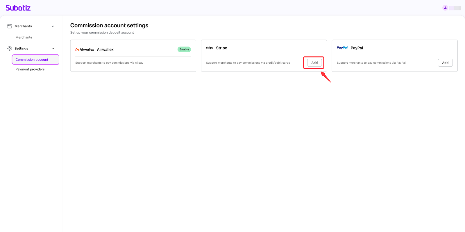 - Get started: Go to Settings > Commission accounts, and click 'Add' to add your commission account under each payment provider. Currently, we support Airwallex, Stripe, and PayPal only.