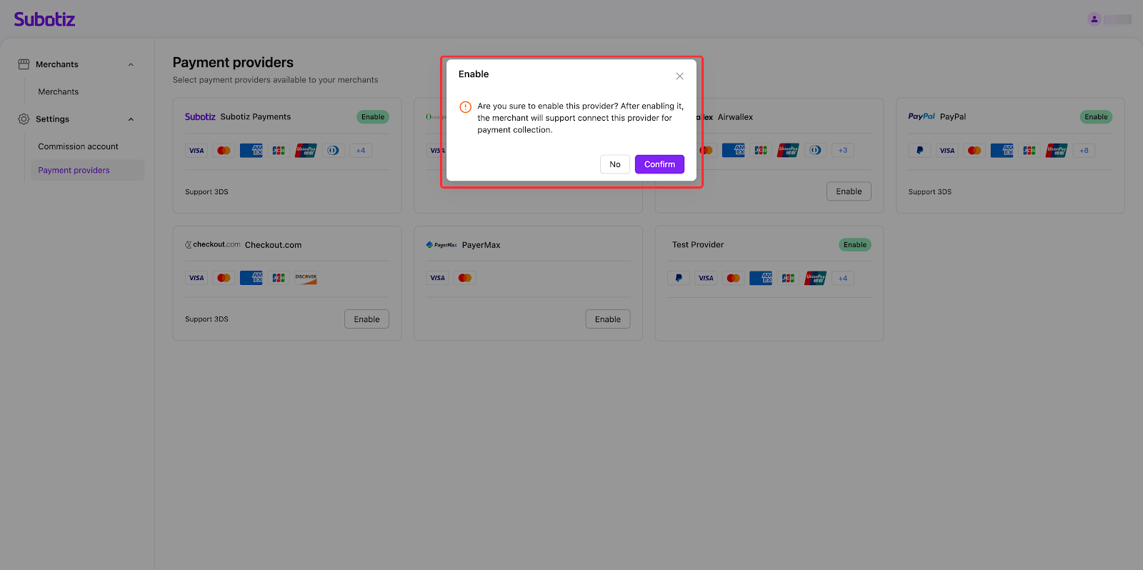 Note: Currently, it doesn't support disabling the payment providers. Please think twice before taking action. If you confirm to enable this payment provider, then click 'Confirm' in the pop-up to complete setup; otherwise, click 'No' to cancel your action.