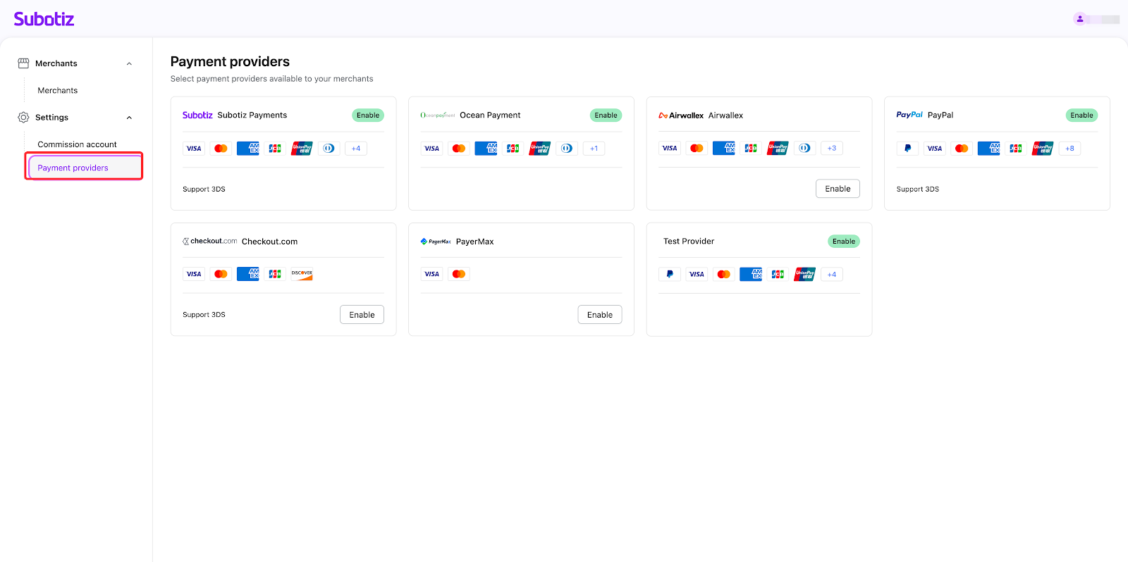 - Get started: Go to Settings>Payment providers to access the setup page. It shows all of the payment providers we support currently, including Subotiz Payments, Ocean Payment, Airwallex, PayPal, Checkout.com, and PayerMax.