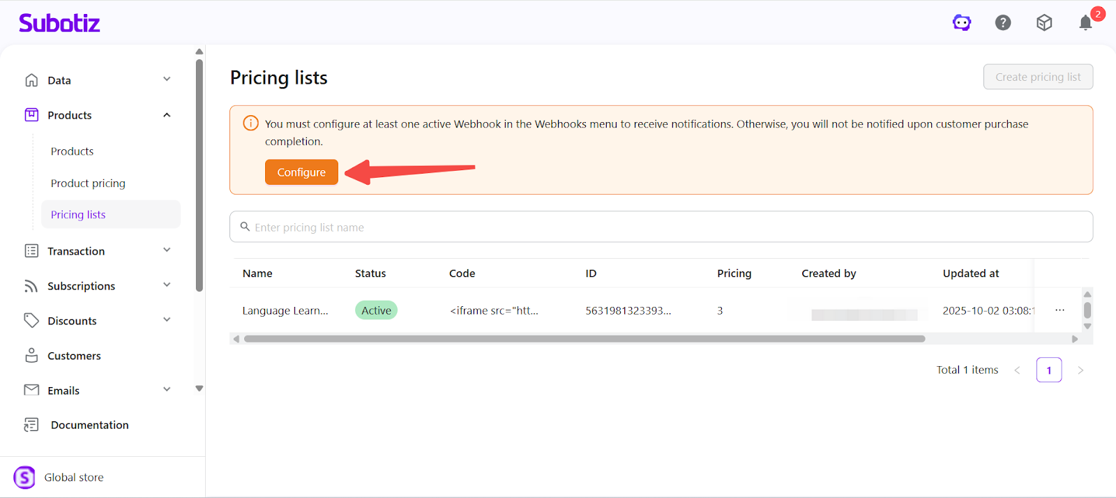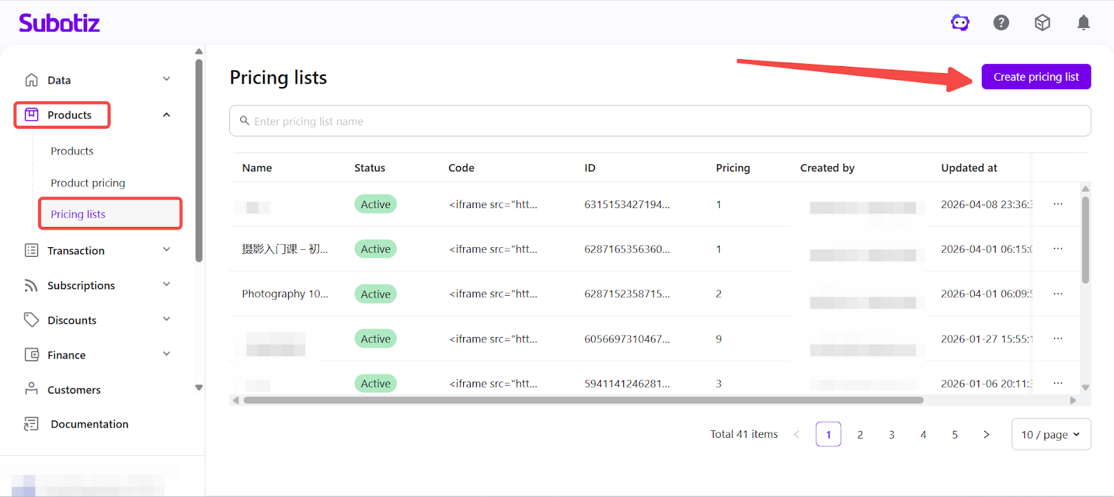 - Open Price List dashboard: In your Subotiz admin, go to Products > Price lists, then click Create pricing list at the top right.