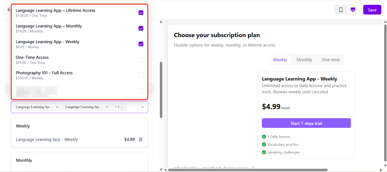 - Description: Short introduction to highlight benefits. (e.g., Flexible options for weekly, monthly, or lifetime access.)