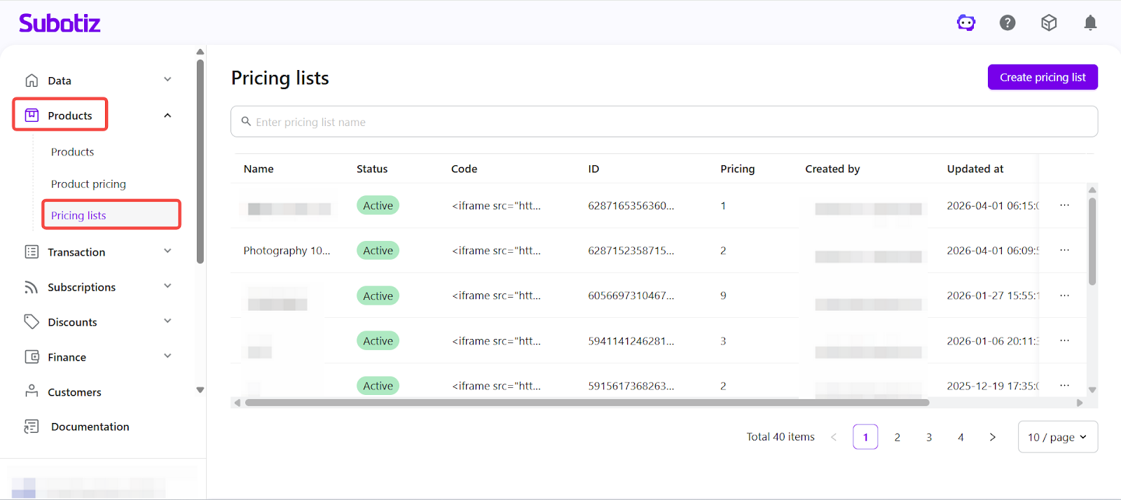 Open the price list dashboard: Go to Products > Price list in the Subotiz admin. The page displays all created price lists, including key details such as name, status, code, ID, number of linked pricing plans, and timestamps.