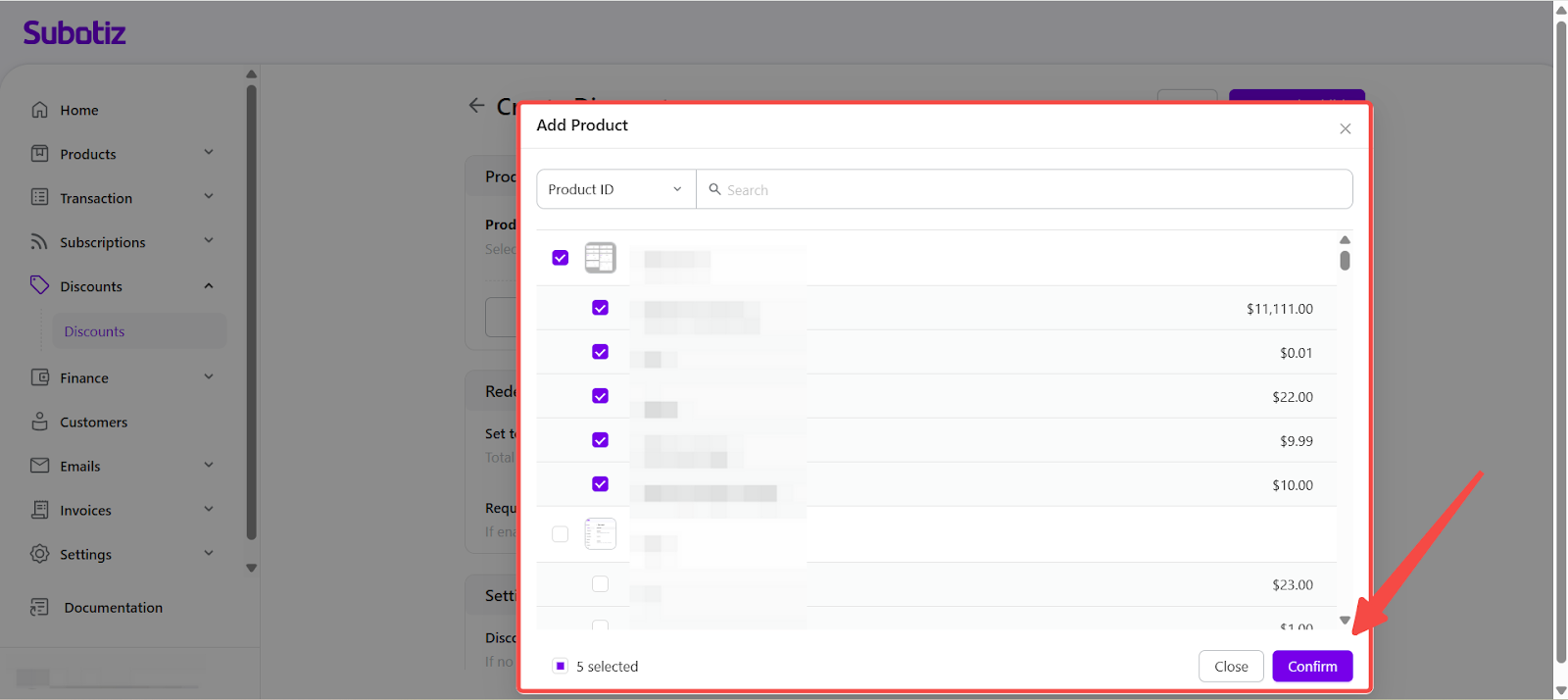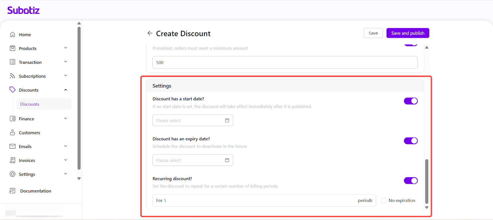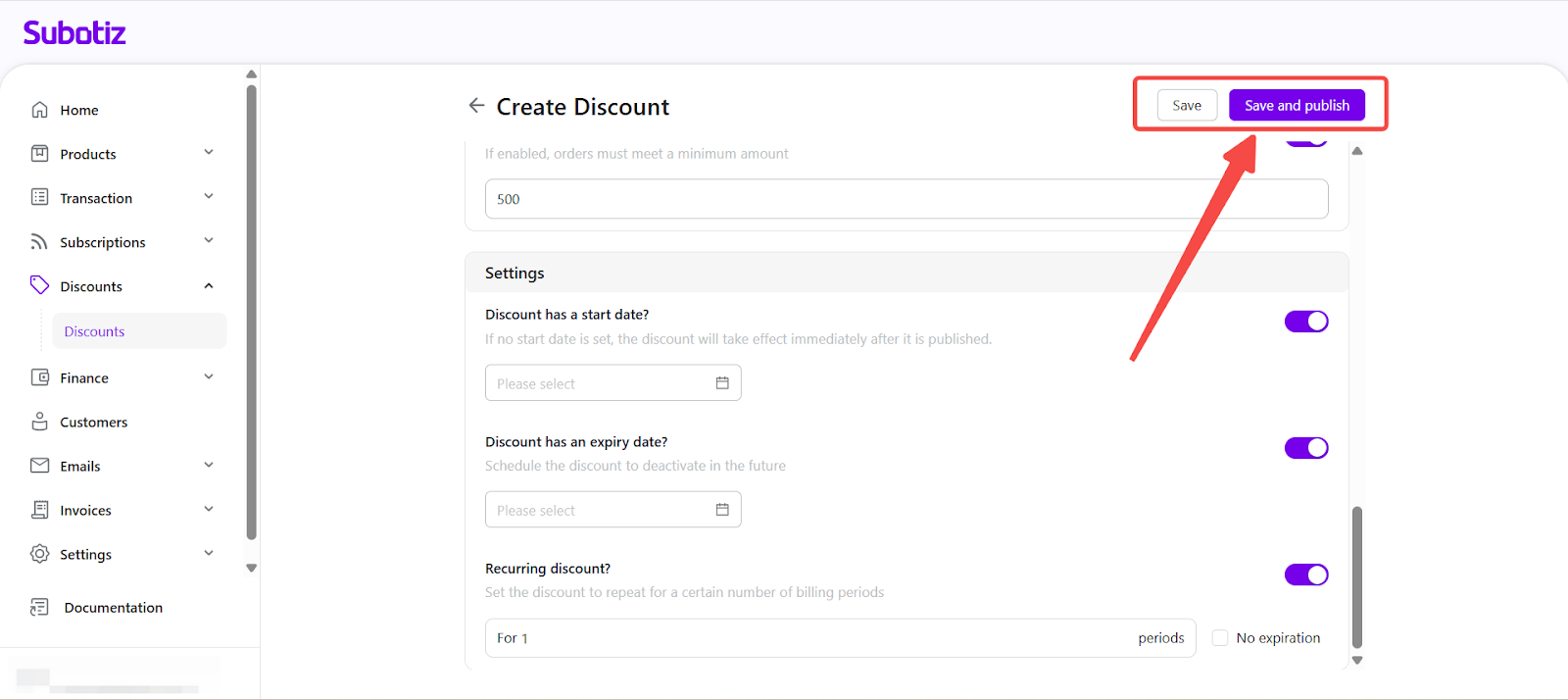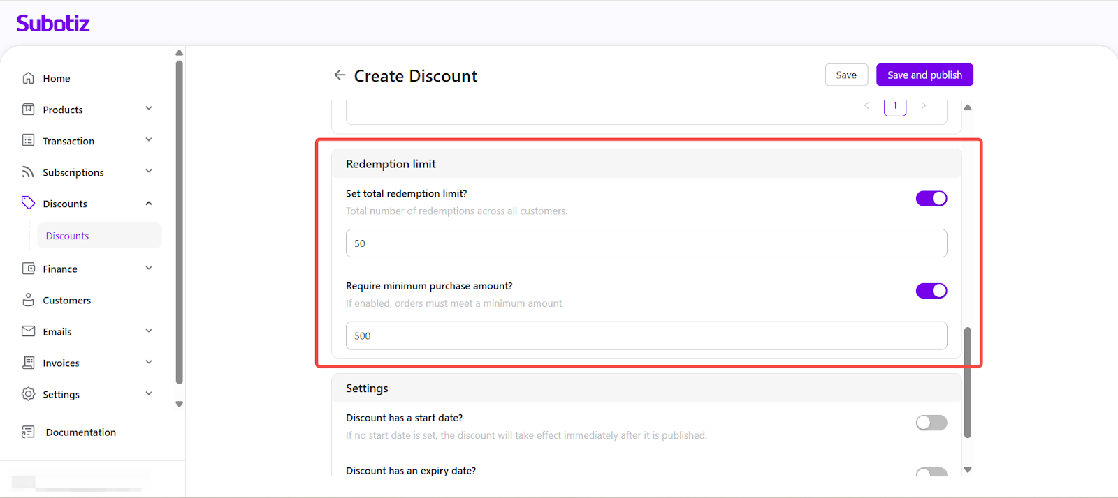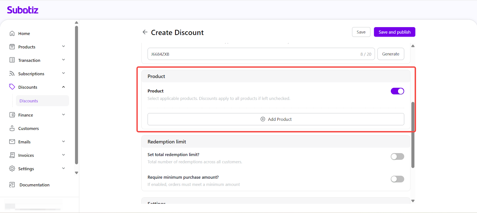The Create Discount feature in Subotiz allows merchants to set up promotional campaigns redeemed by code at checkout. Discounts can be configured with product scope, usage limits, and scheduling, providing flexible tools for promotion management.