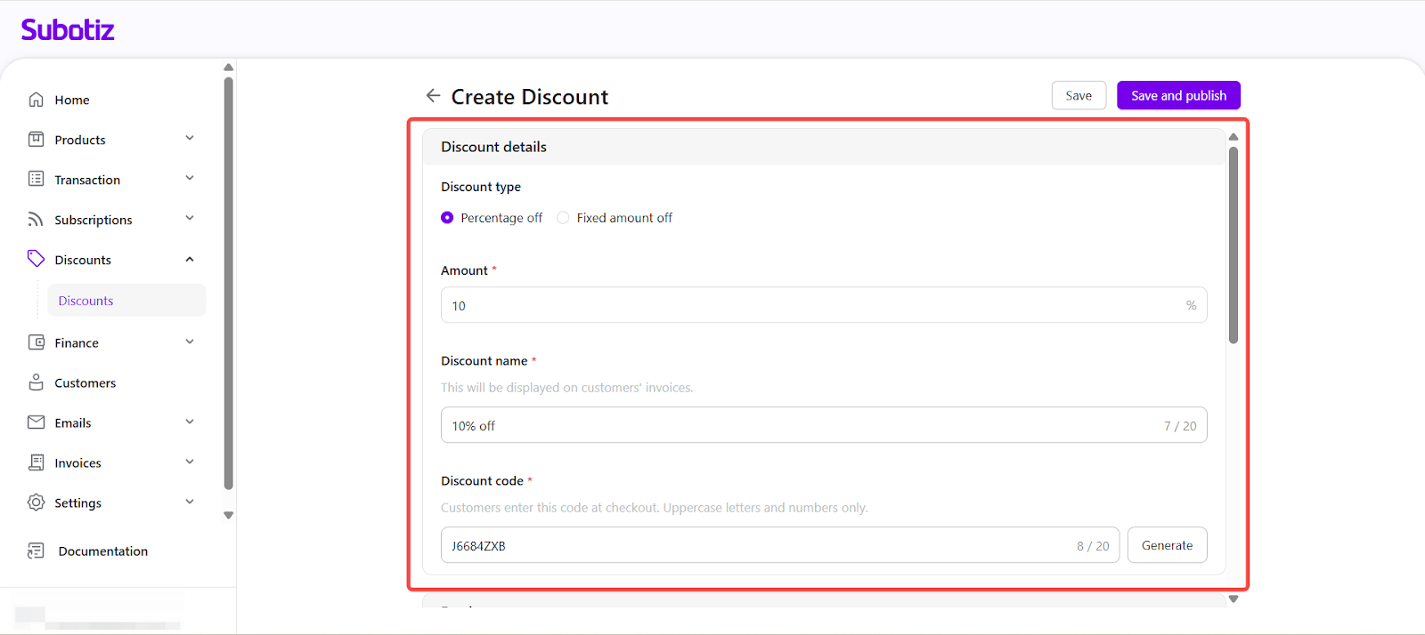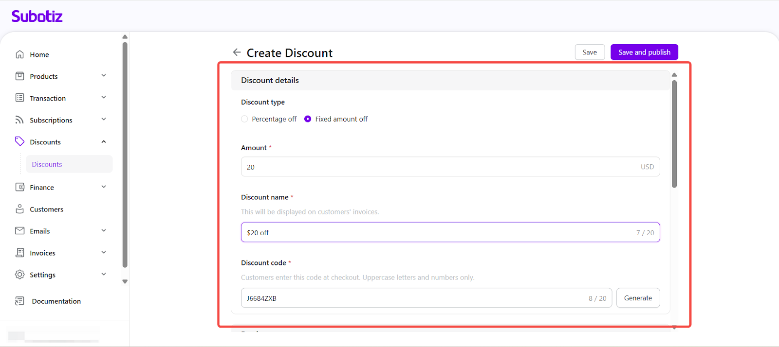 - Discount code: Enter or generate an alphanumeric code (2–20 characters). Codes support only uppercase letters and numbers.