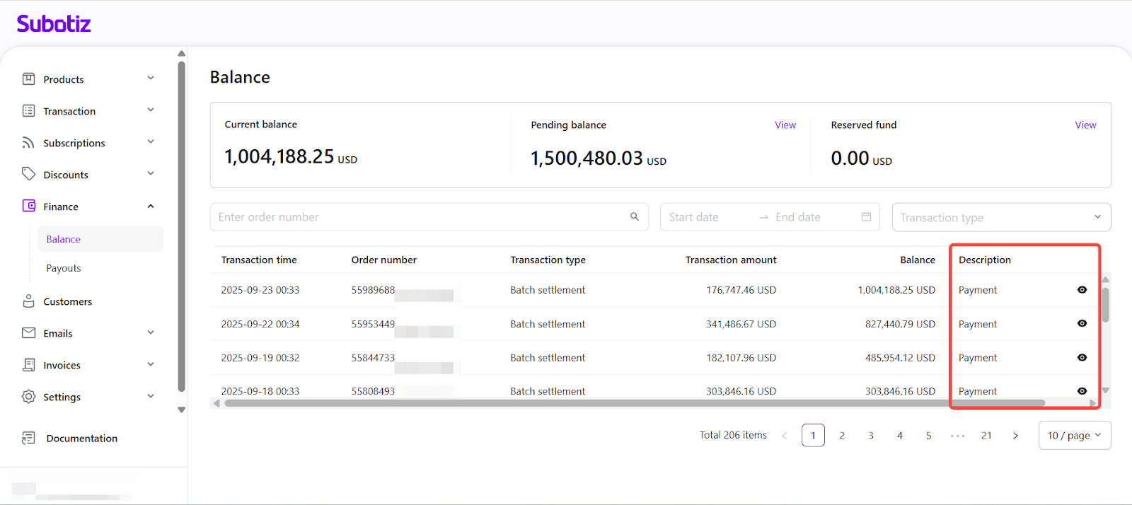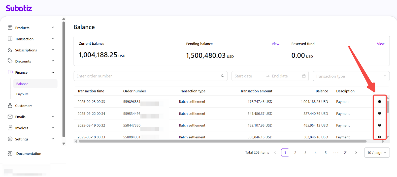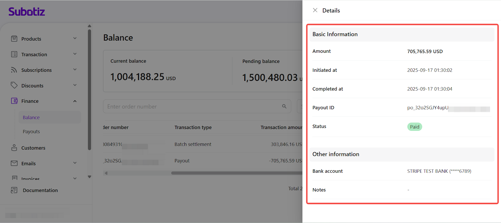 - Access transaction list: In the Subotiz admin, go to Finance > Balance and scroll to Transaction list. The Description column shows a system-generated label for each transaction type. An eye icon shows that detailed records are available; select it to open the detail panel.