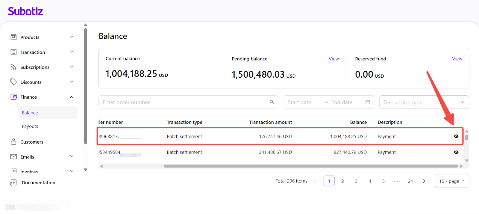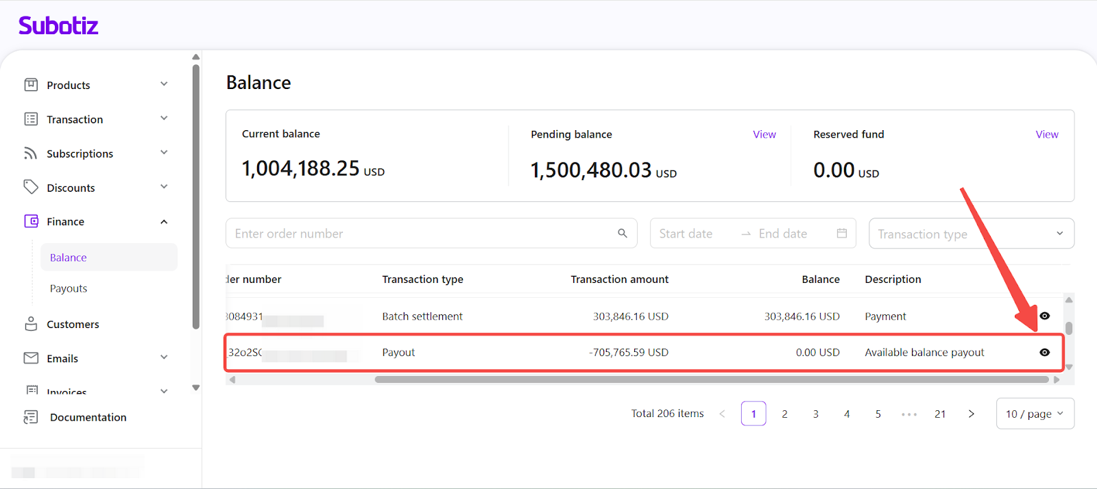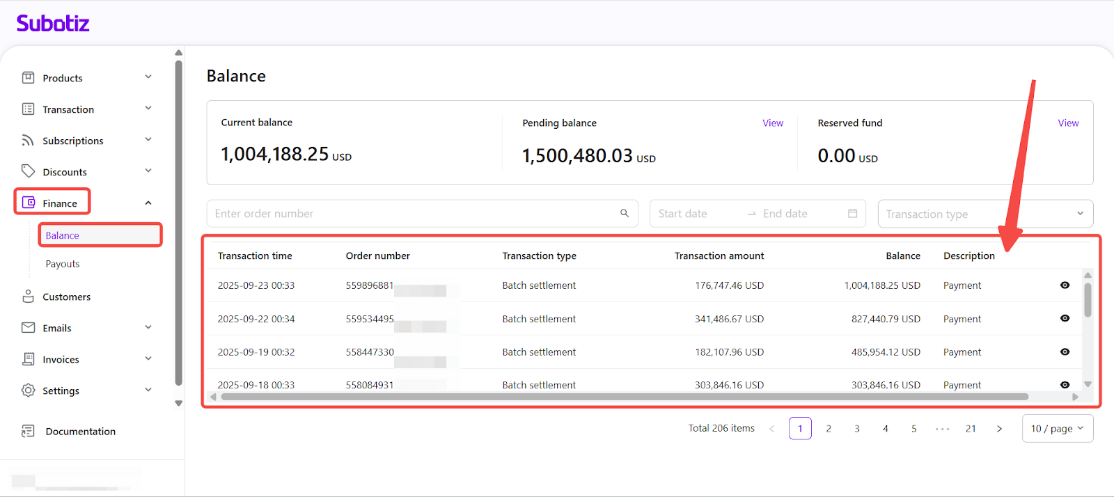 - Access transaction list: In the Subotiz admin, go to Finance > Balance and scroll to Transaction list. The Description column shows a system-generated label for each transaction type. An eye icon shows that detailed records are available; select it to open the detail panel.