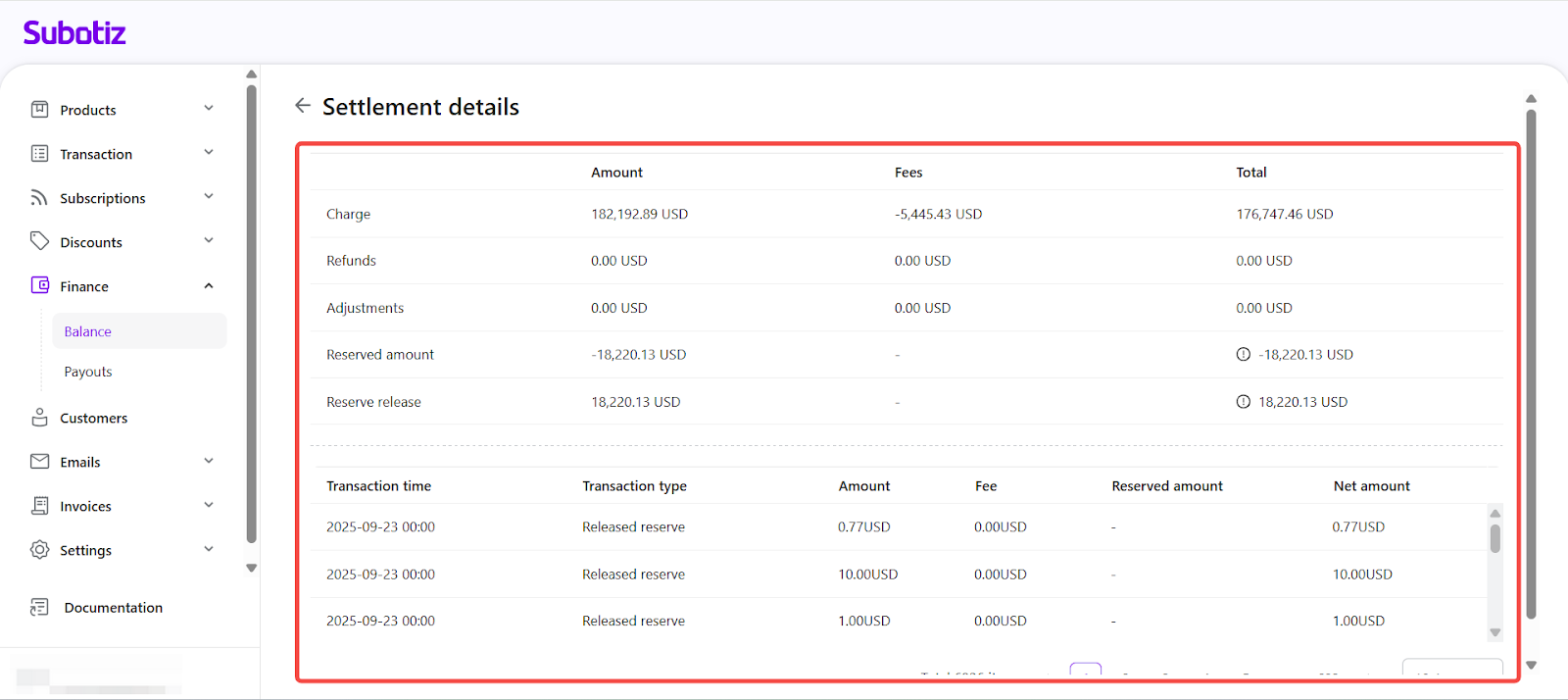 The Description and Detail View features in Subotiz provide context for each transaction in the Balance section, showing the purpose of each entry and when settlement data is available for reconciliation and audits.