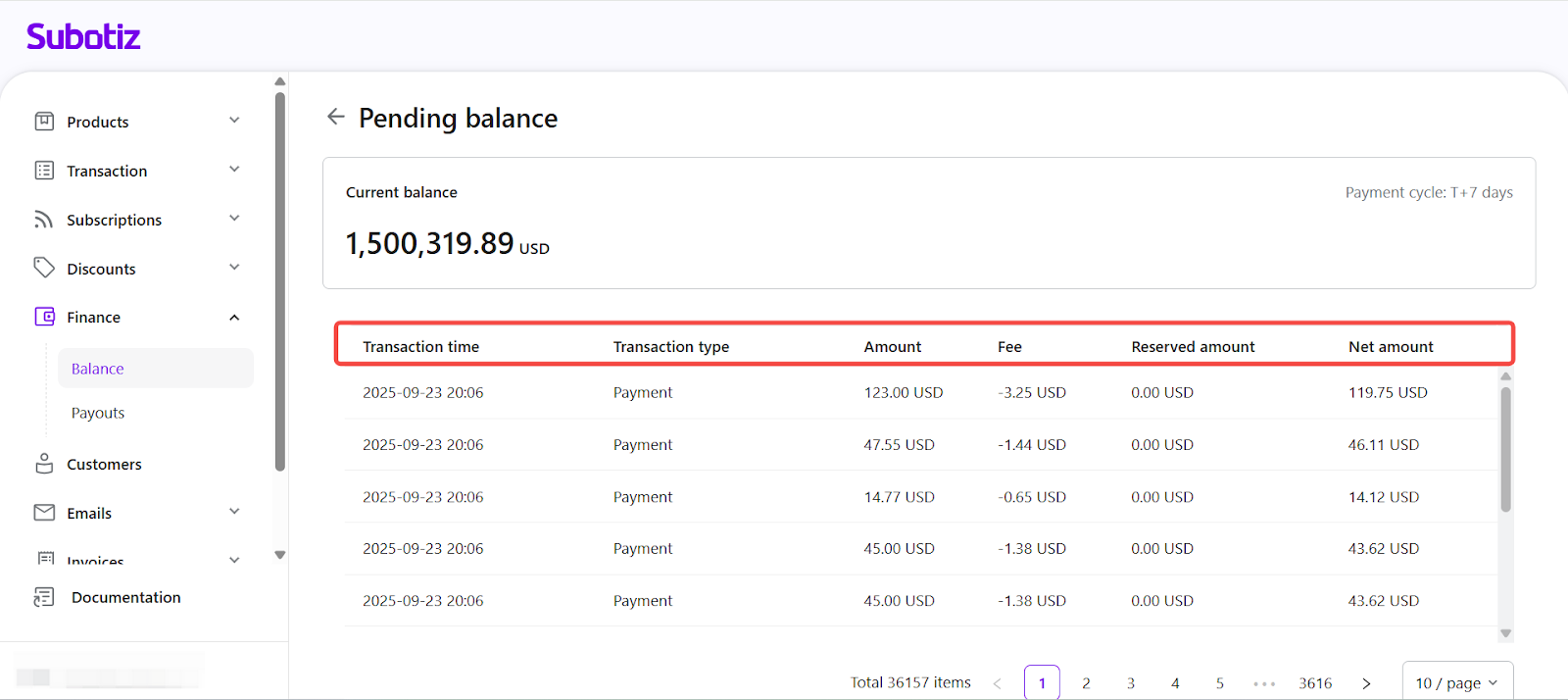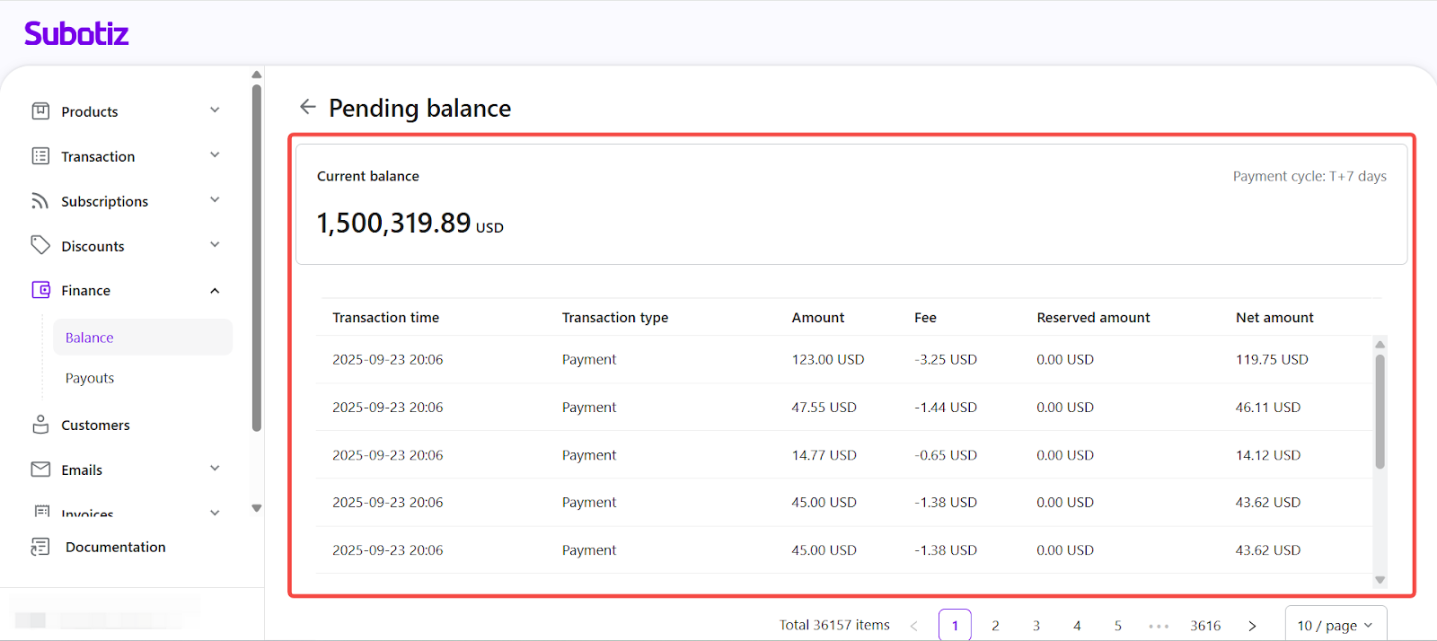 - Open Pending balance: From the Finance > Balance page in the Subotiz admin, select View next to Pending balance.