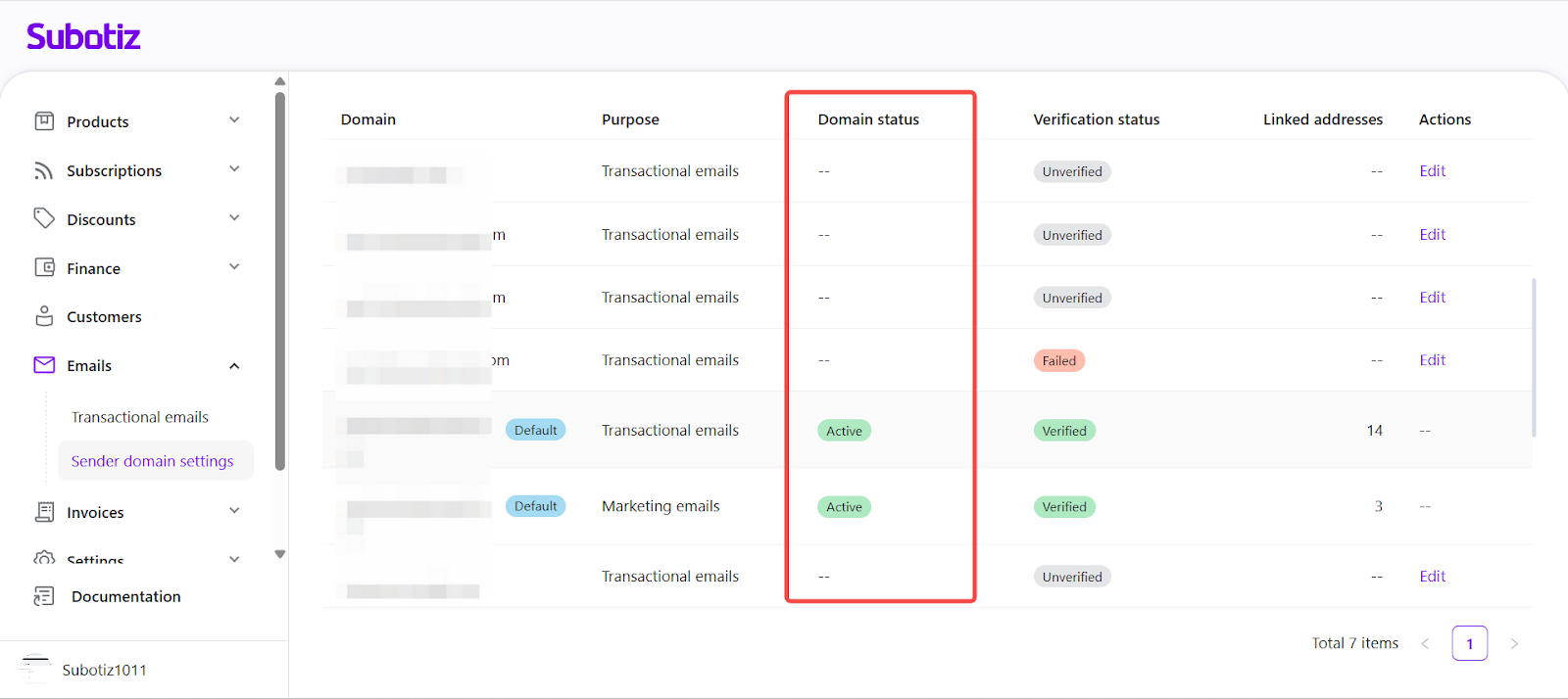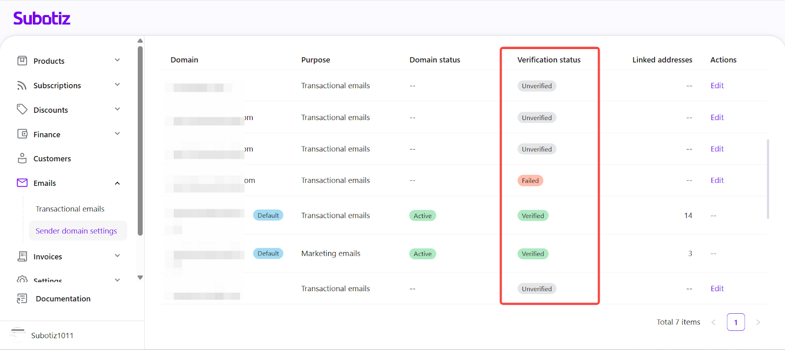 - Go to Emails > Sender domain settings, locate the Sender domains list, and find the domain marked as Unverified or Failed. In the Actions column, click Edit.