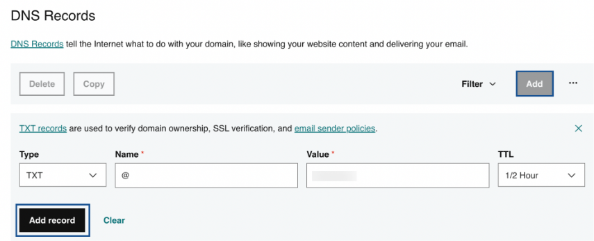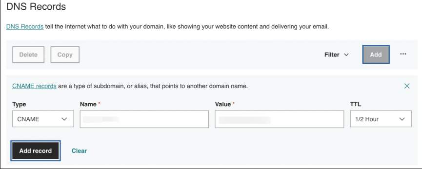 Example: GoDaddy DNS record entry (applies to TXT and CNAME):