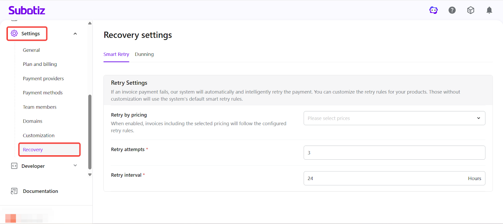 To review Recovery settings: Navigate to Settings > Recovery in your Subotiz Admin. On this page, merchants can view the overall configuration of Recovery, including the status of Smart Retry and Dunning.