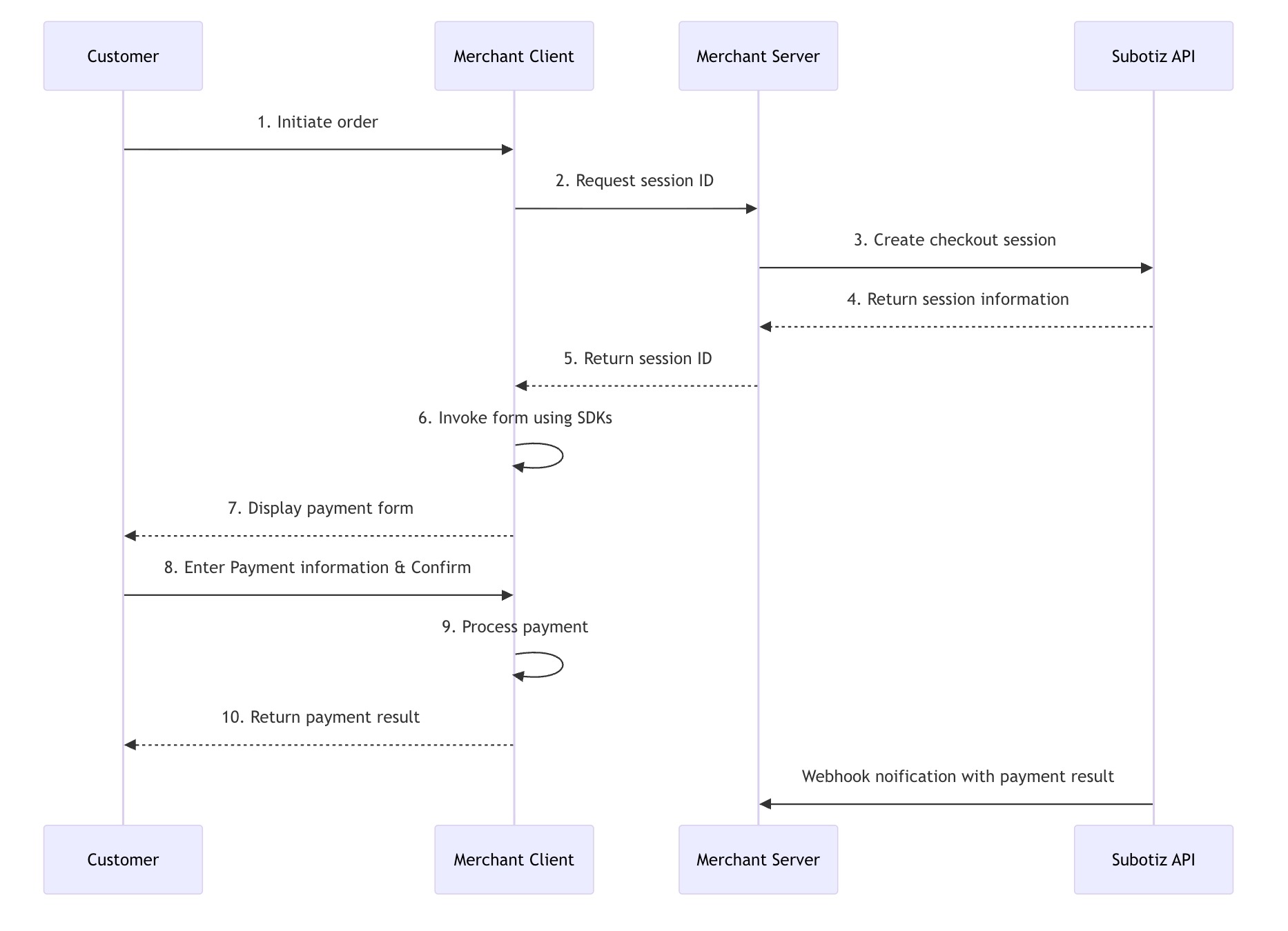 order_id) as a parameter during creation. Thisorder_idis crucial for subsequently correlating the trade order. - The Checkout Session provides a Session ID. Your client-side application can then use the SDK to invoke and display the Subotiz payment form to the customer.